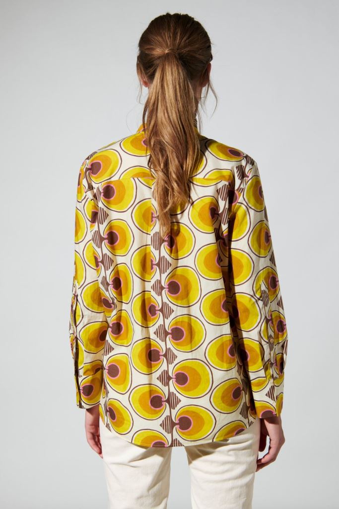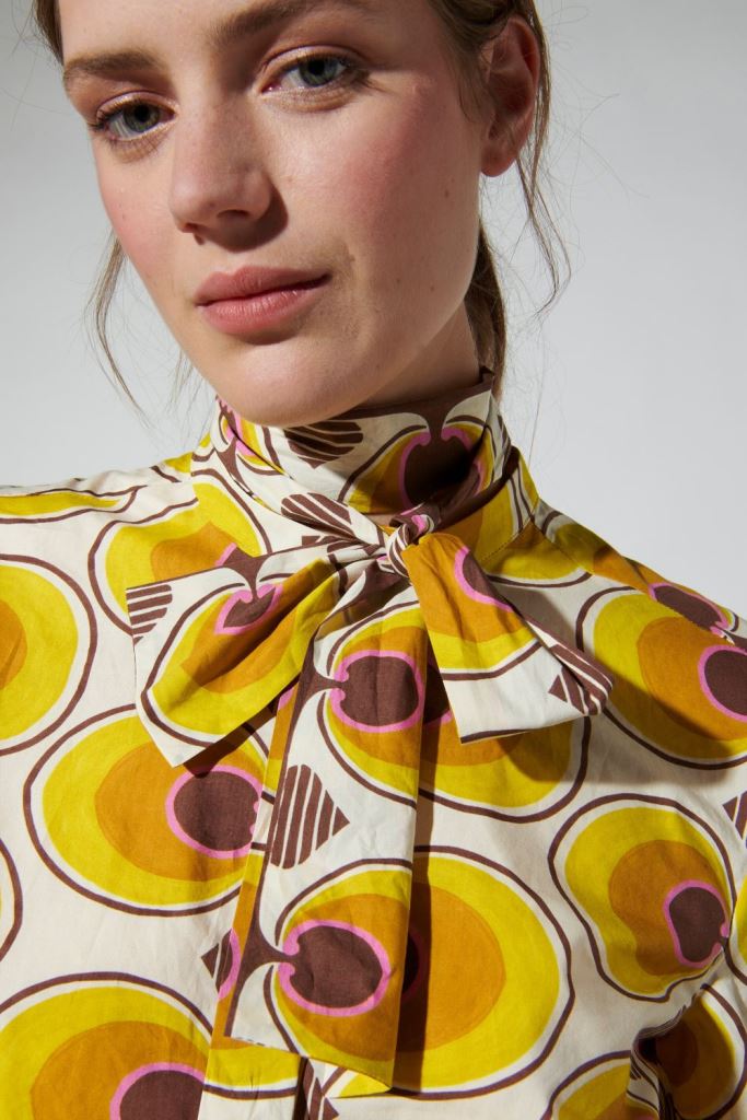 Блуза-сорочка з ексклюзивним графічним ретро-принтом.Застібається на гудзики. На комірі стрічки, які зав'язуються на бант. Має подовжену спинку.