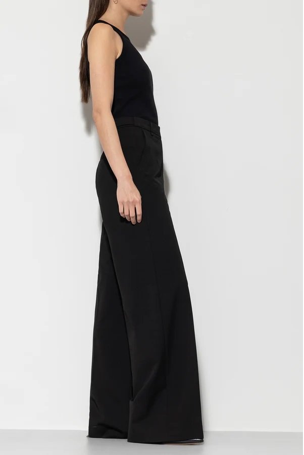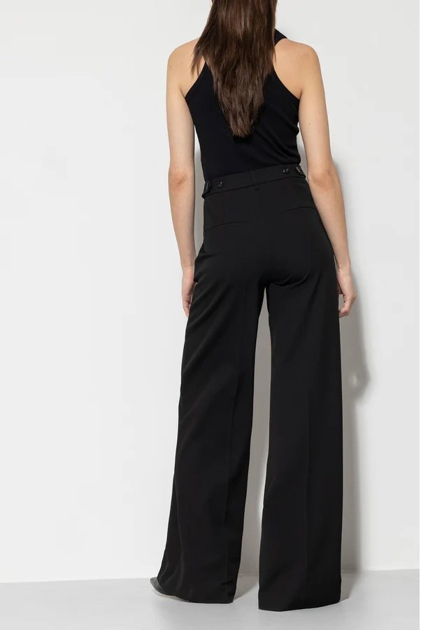 Брюки з м'якої техно-вовни широкого крою зі складками. Пояс з петлями для ременя регулюється по ширині за допомогою ґудзиків.