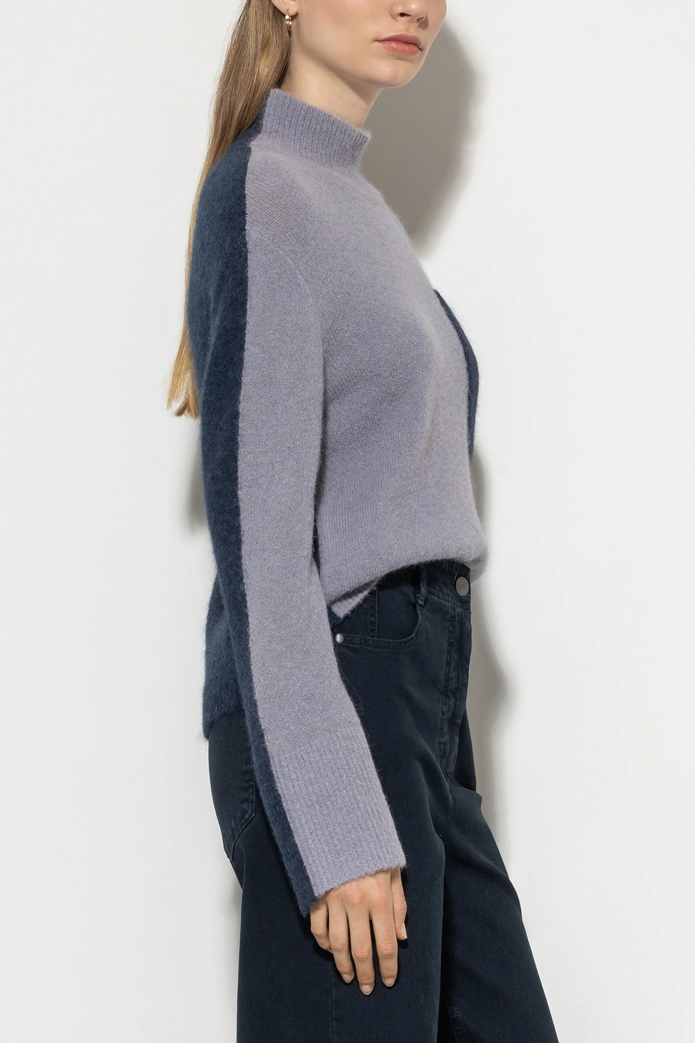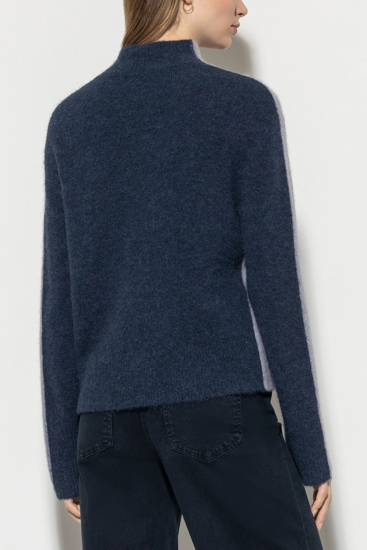 Светр з високоякісної італійської еластичної пряжі з особливо м'яким на дотик та приталеним коміром. Спинка та накладна нагрудна кишеня виконані в контрастному кольорі.