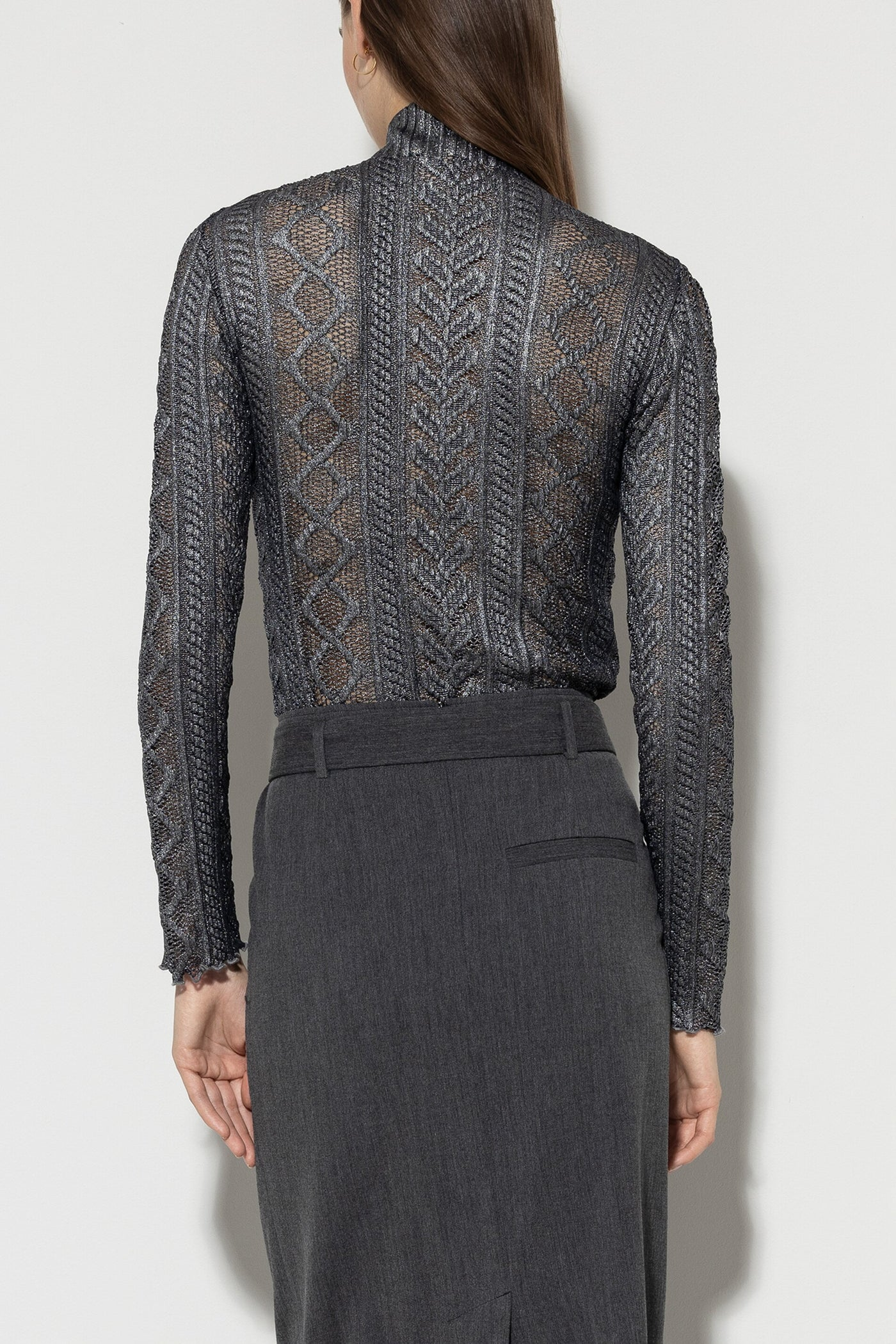 Гольф з довгими рукавами з еластичного мережива з блискучим металевим напиленням. Відрізний комір та рюші на подолі завершують образ.