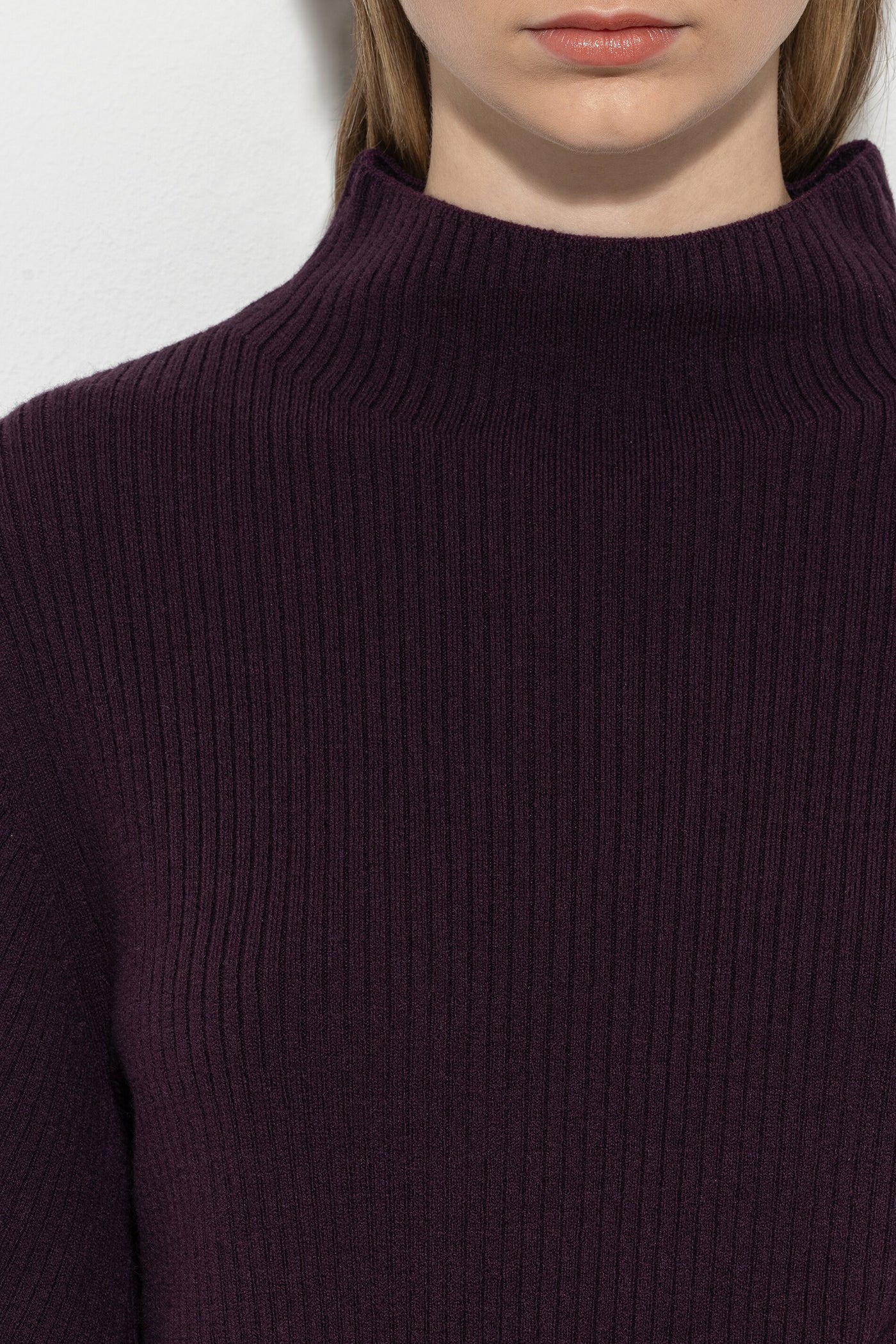 Светр з легкої вовняної пряжі з відрізним коміром. Виразна ребриста фактура визначає весь образ.