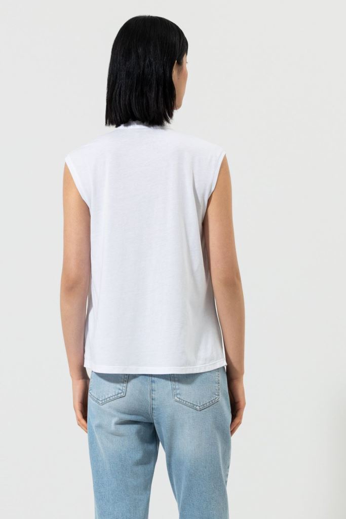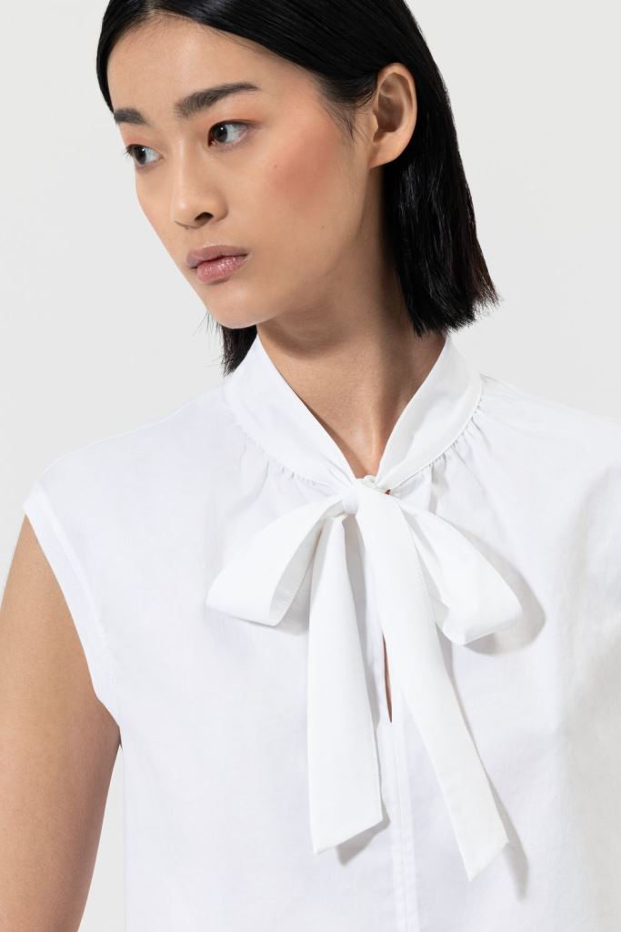 Топ з міксу бавовни та еластану із зав'язкою, боковими розрізами та дрібними оборками на комірі. Передня частина виконана зі стрейчової бавовни, спинка - з м'якої суміші модальної бавовни.