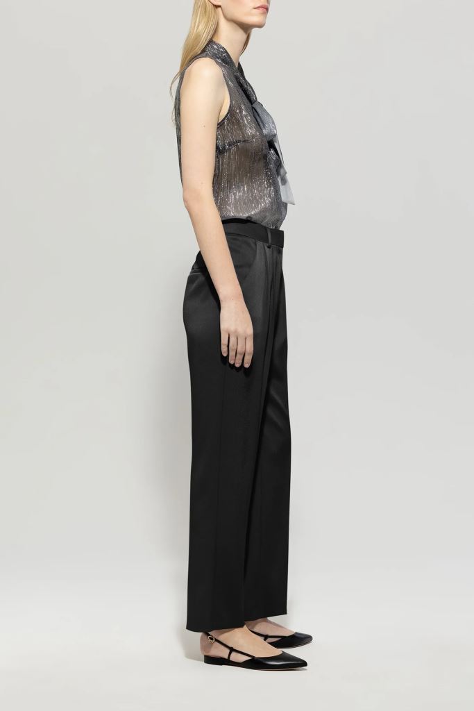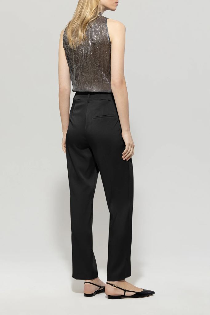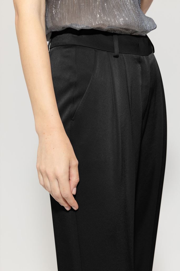 Завужені брюки з струмливого триацетатного крепдешину з блискучим атласним покриттям. Штани мають дві бокові кишені та врізну кишеню ззаду, а складки підкреслюють елегантний крій.