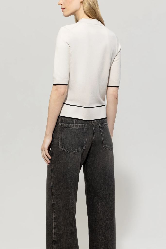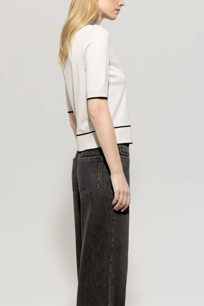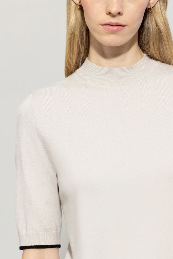 Джемпер з напівприталеними рукавами з тонкого трикотажного віскозного стрейчу з віскозою, сертифікованою Lenzing Ecovero. Дизайн вирізняється високим ребристим круглим вирізом горловини та смугастими деталями на подолах.