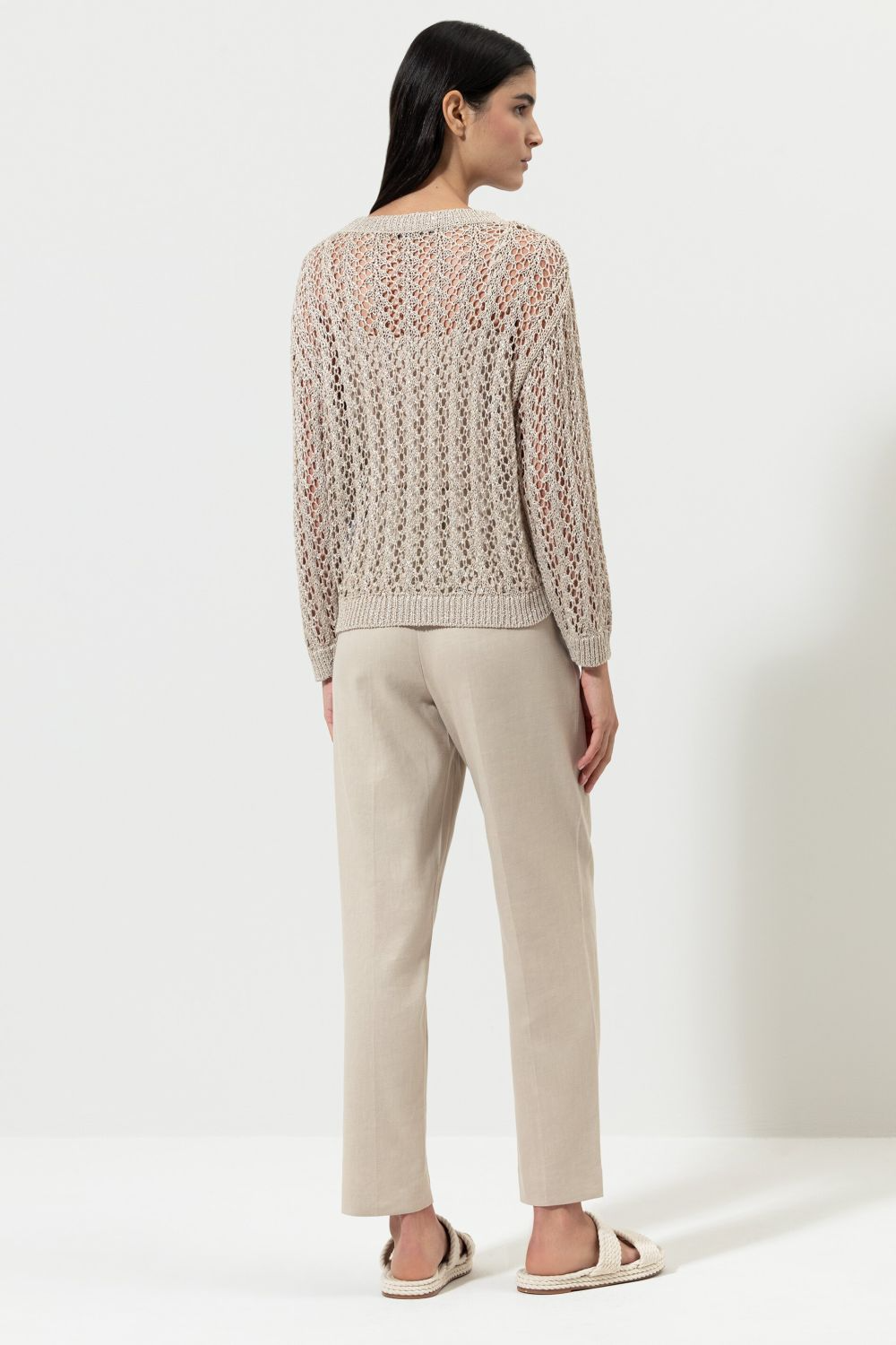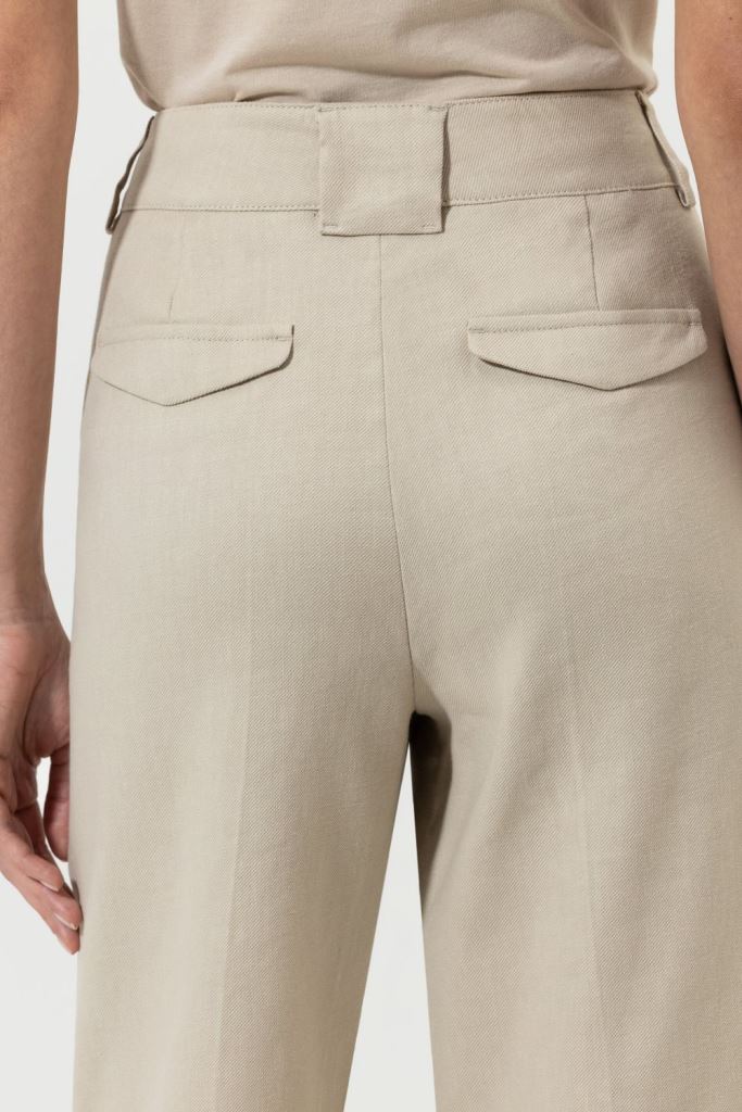 Легкі брюки з завуженою штаниною з розкішного лляно-бавовняного стрейчу в габардиновому переплетенні з широкими петлями для ременя, двома прорізними кишенями попереду та двома кишенями з клапанами позаду. Мають пресовані складки.