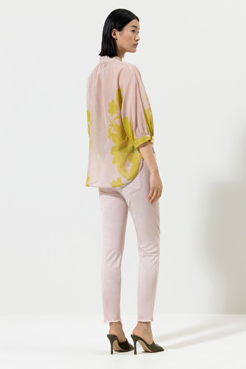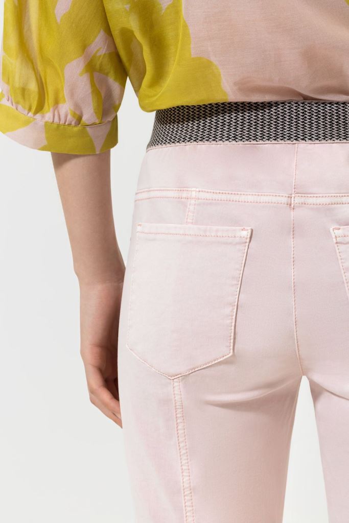 Еластичні брюки завуженого крою з частково еластичним поясом, розділовими швами позаду та чотирма кишенями. Укорочені штанини закінчуються відкритим подолом.