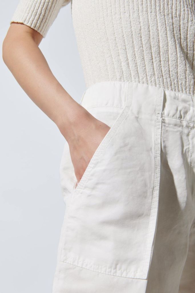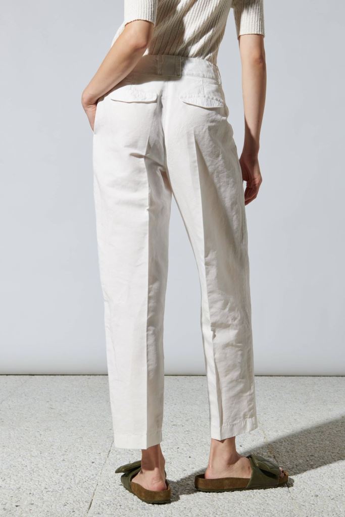 Брюки виготовлені з льону та бавовни. Має приховану застібку та петлі для ременя. Складки попереду додають стильності даній моделі.