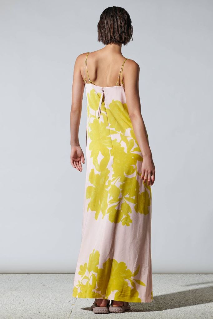 Ця сукня виготовлена з струмливої, непрозорої віскозної саржі. Прикрашена ексклюзивним квітковим візерунком. Сукня має подвійні бретелі-спагеті, які можна зав'язати окремо.