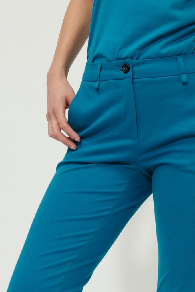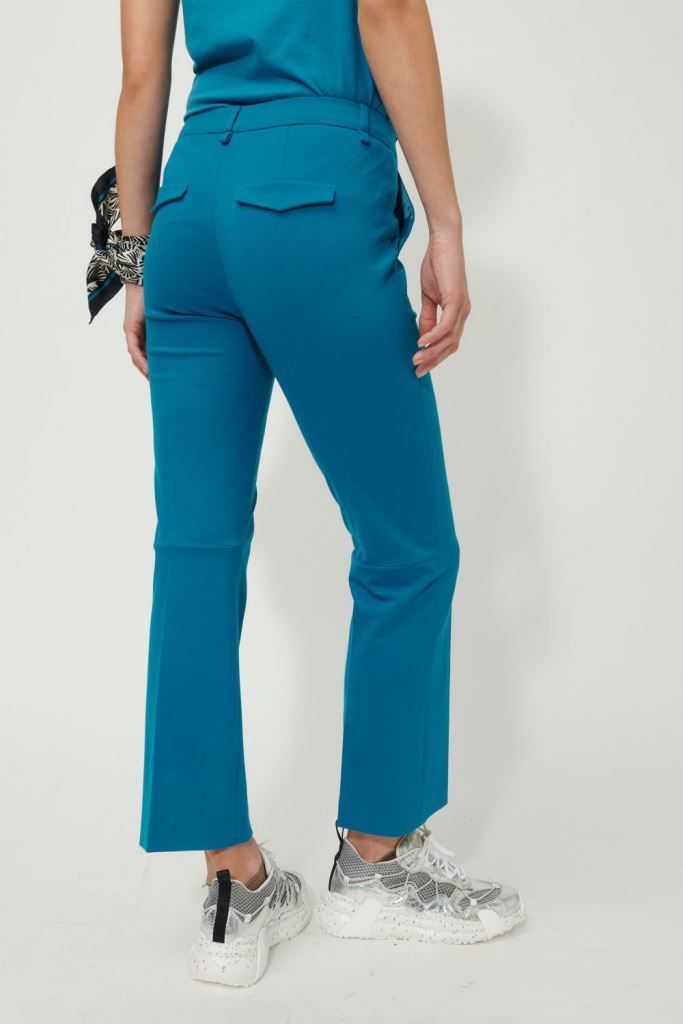 Укорочені брюки-кльош з тканини Punto Milano з петлями для ременя та складками. Попереду дві прорізні кишені, позаду - дві врізні кишені з клапаном та розділові шви.