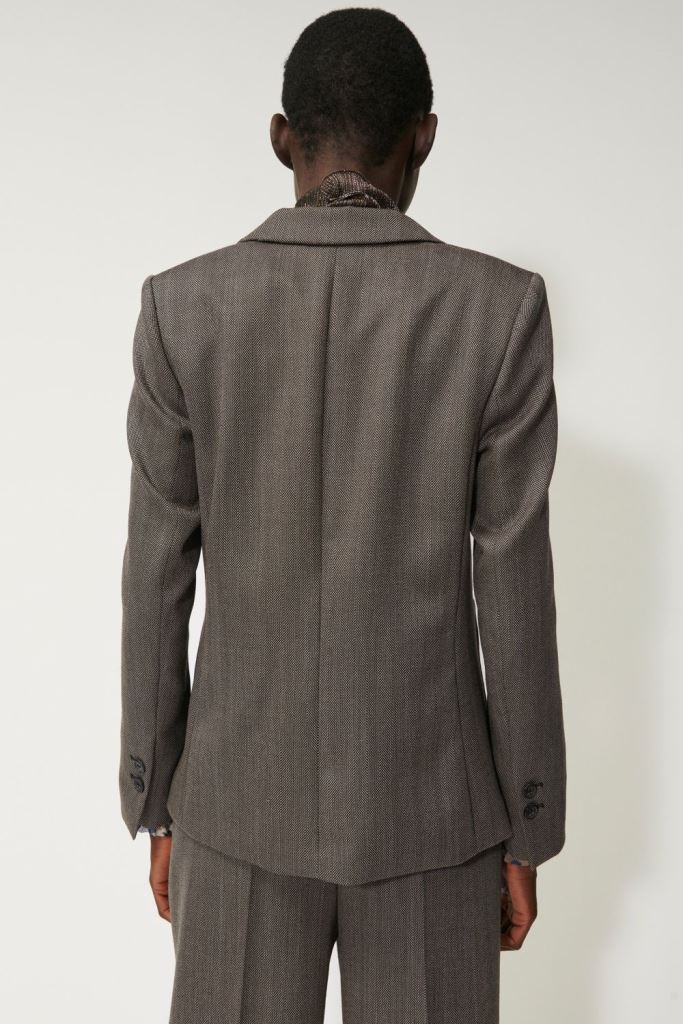 Повсякденний жакет на одному гудзику витонченого жіночного силуету з тонкого двоколірного твіду. Попереду дві накладні кишені.
