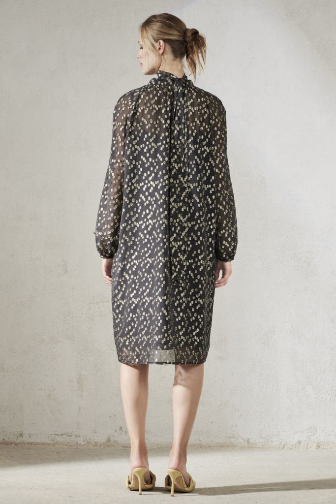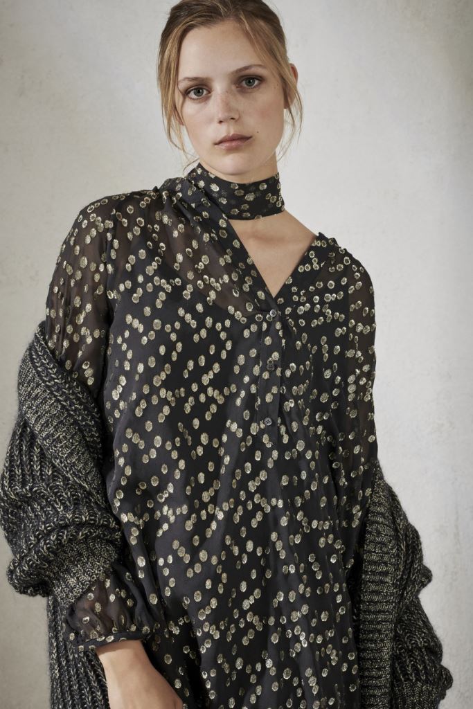 Сукня-туніка з легкими рюшами виготовлена з напівпрозорого шовкового поєднання розкішних крапок в стилі купе та блискучої пряжі, має V-подібний виріз та коротку планку на ґудзиках. Талія жіночно підкреслена поясом. Нижня частина сукні з регульованими лямками забезпечує непрозорий вигляд.