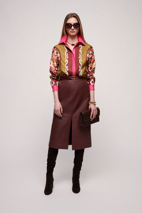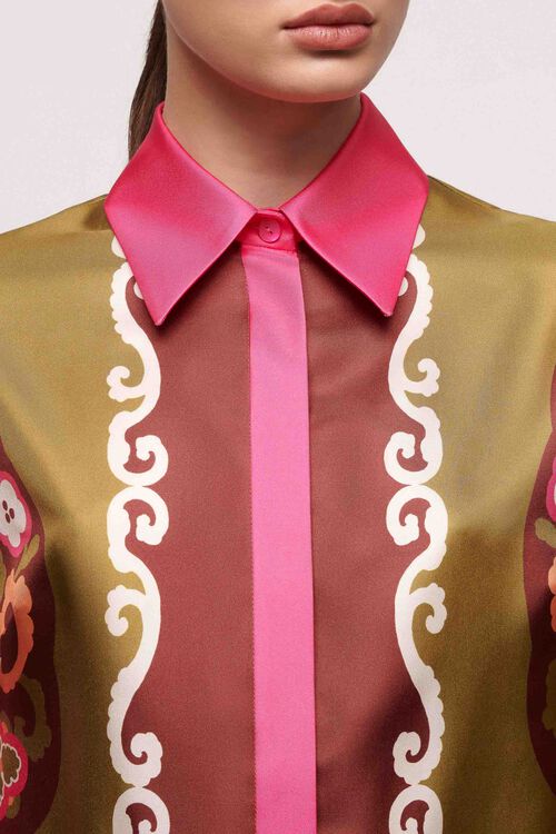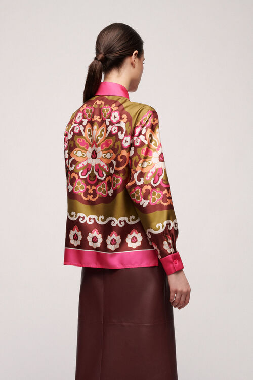 Елегантна сорочка з чистого шовку з жакардовим візерунком, загостреним коміром і довгими, злегка пишними рукавами, що закінчуються манжетами.