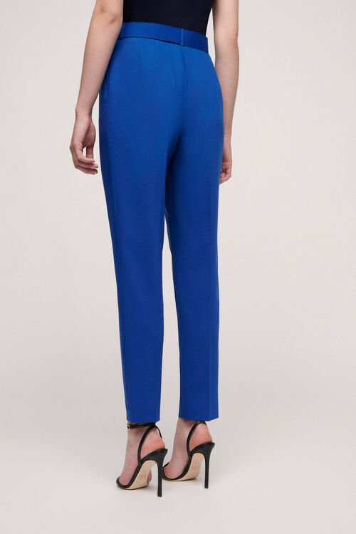 Брюки з еластичного вовняного міксу із завищеною талією, з поясом, обтягнутим тканиною тон в тон. Прорізні кишені. Застібка на блискавку та гачок.
