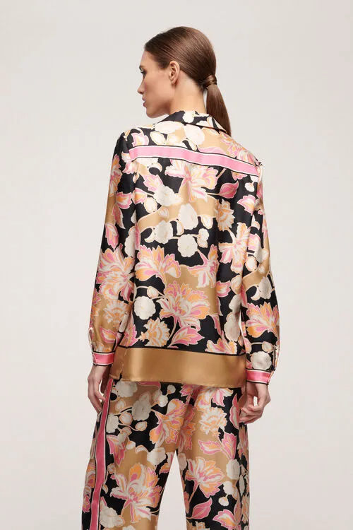 Блуза з чистого шовку з квітковим принтом, комір-боулінг, довгий рукав, ґудзики в тон з перламутру.