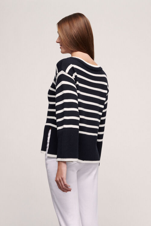 Смугастий пуловер у моряцькому стилі з однотонної в'язки, з горловиною-човником і ребрами на манжетах і талії.