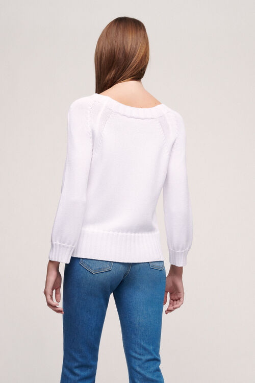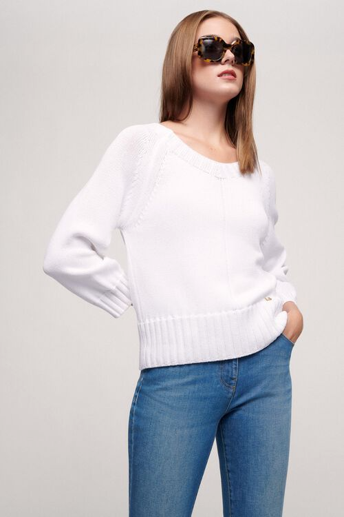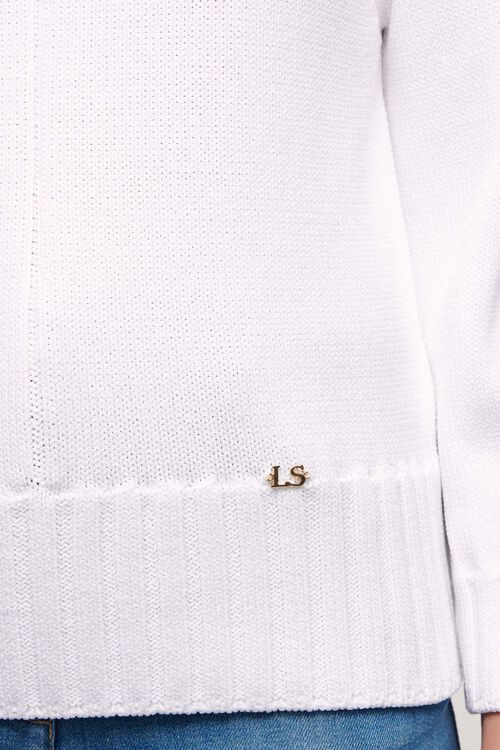 Однотонний пуловер з гладкої в'язки, з широким, витонченим V-подібним вирізом і центральною ребристою деталлю. Ребра по горловині, манжетах і лінії талії.