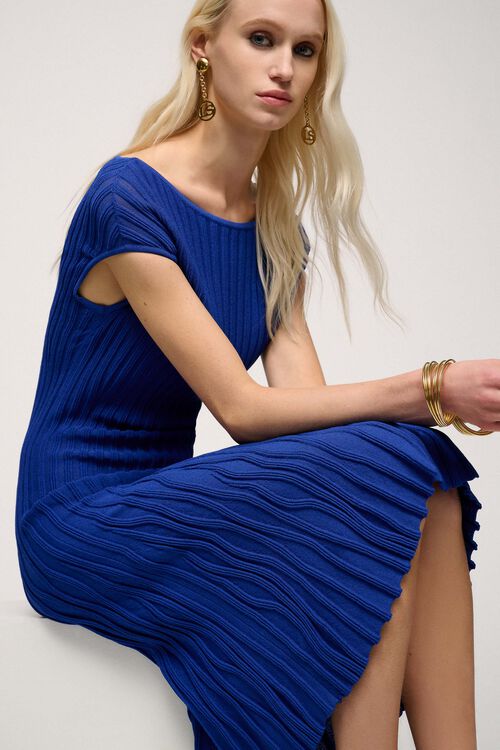 Трикотажна сукня з віскози, з паралельною ребристістю на грудях і візерунком від талії донизу. Довжина до коліна.