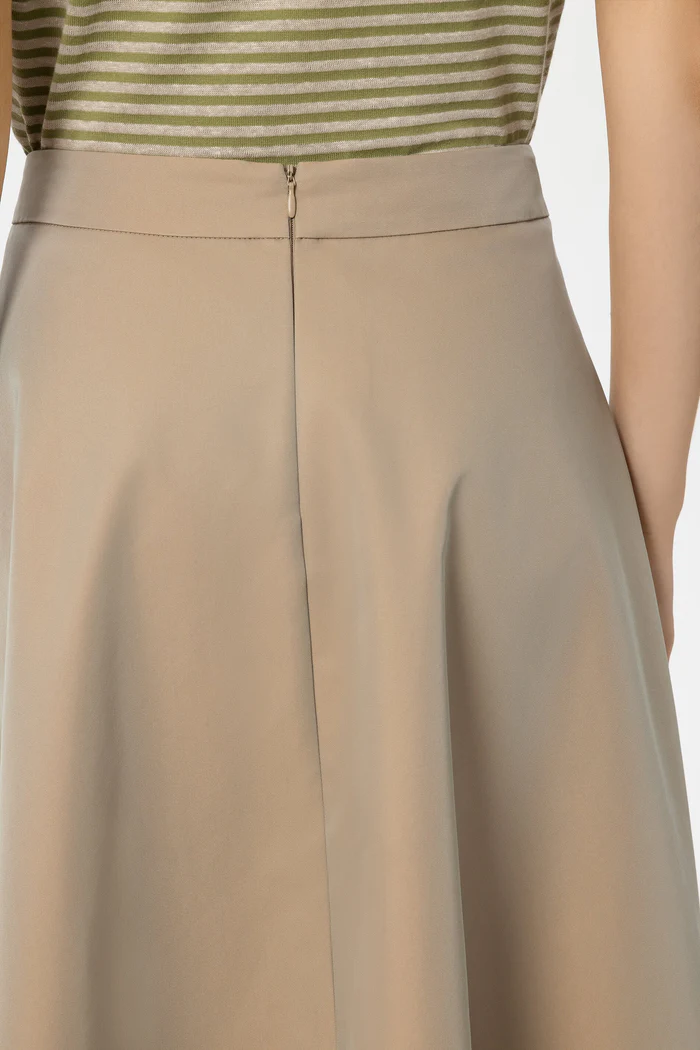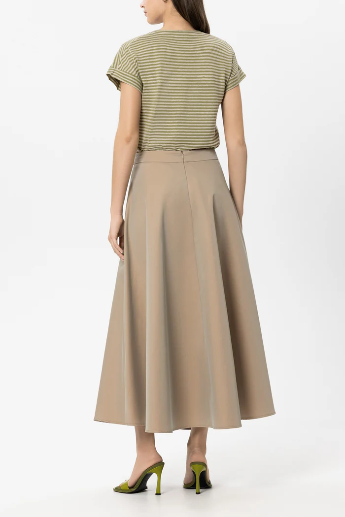 Максі-спідниця розкльошеного крою, виготовлена з вишуканої, злегка переливчастої суміші бавовни для вуличного одягу. Ззаду розташована прихована блискавка.