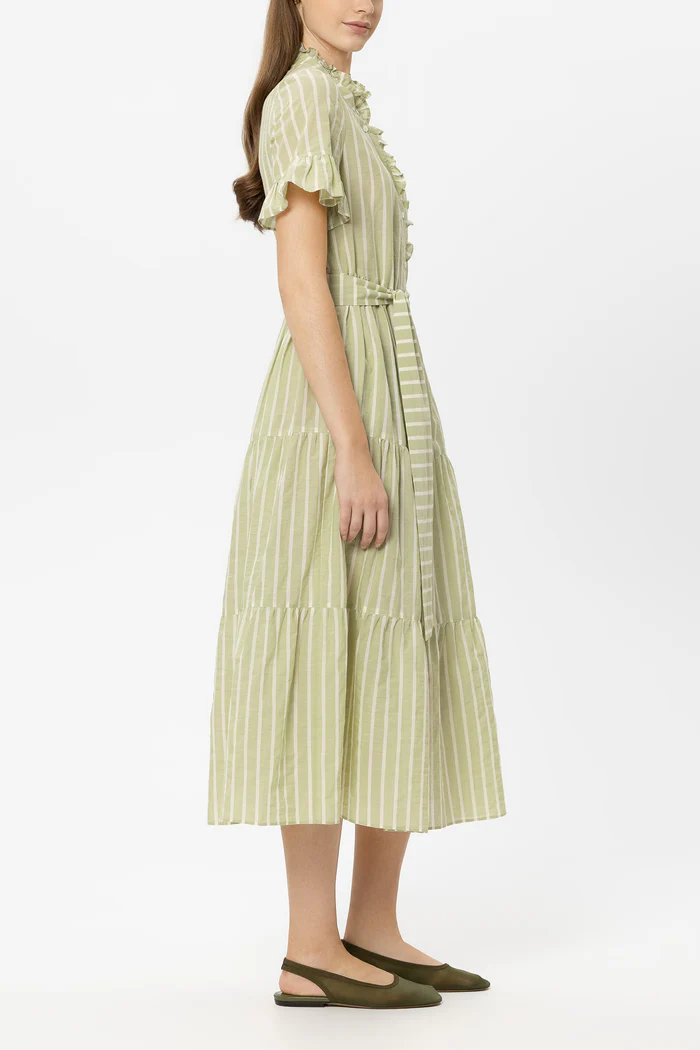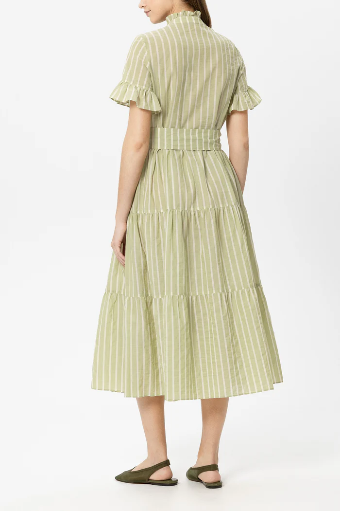 Довга сукня-сорочка розкльошеного крою з бавовняного вуалю у смугастий візерунок, з напівзастібкою на ґудзиках та спідницею з воланами. Короткі рукави-крильця та комір-стійка оздоблені рюшами. За допомогою зав'язувального пояса можна підкреслити талію.