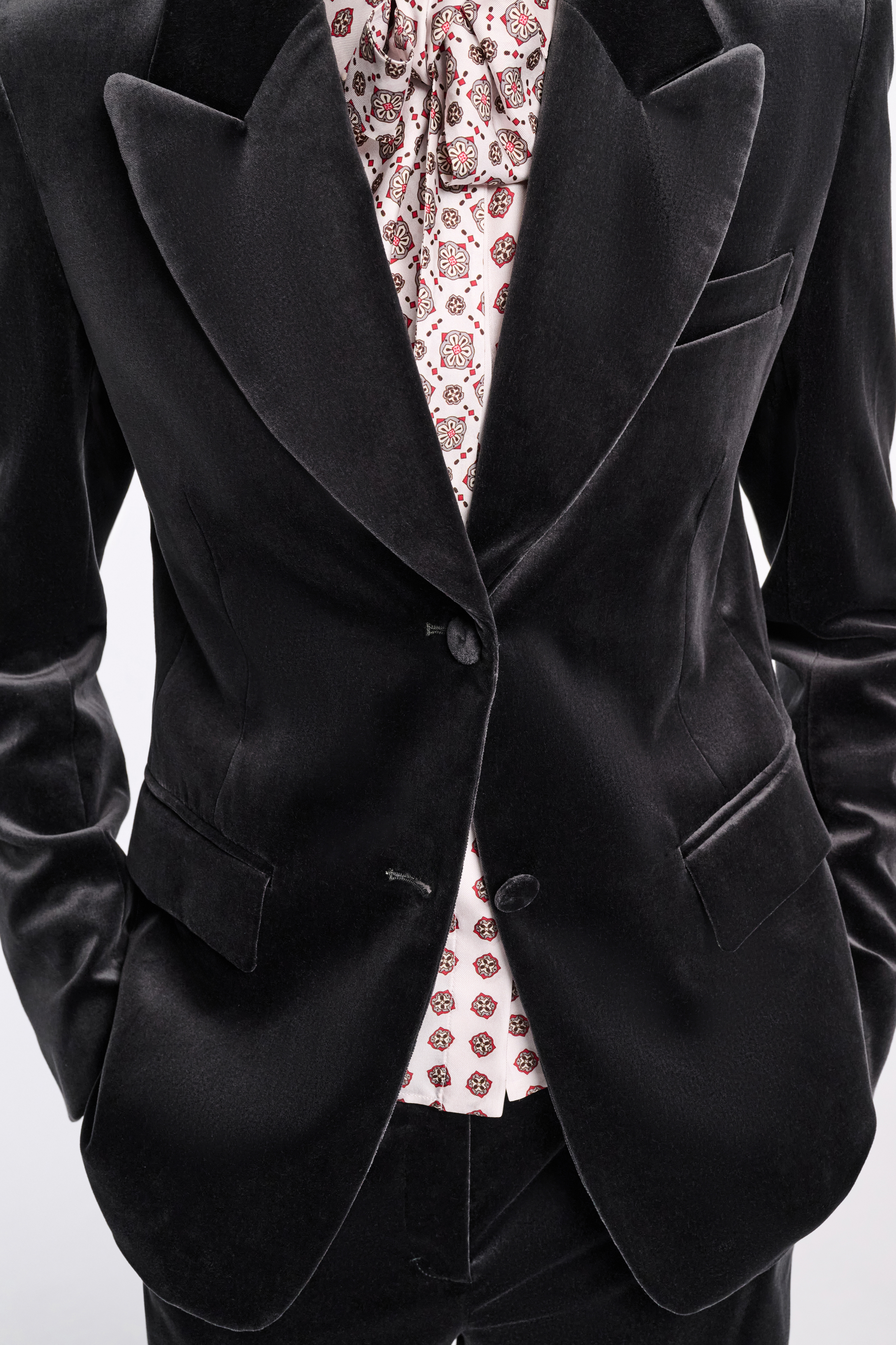 Найм'якший костюм: оксамитовий блейзер виготовлений із еластичної бавовняної суміші та має відповідні обтягнуті ґудзики. Стрункий крій має атласний лацкан і може носитися як костюм із відповідними штанами.