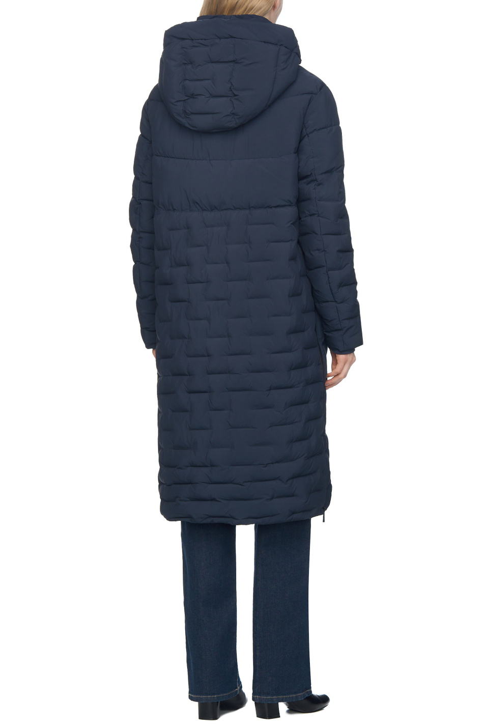 Стьобане пальто з високим коміром та капюшоном. Застібається на блискавку та кнопки. Має бокові кишені на кнопках. Довжина нижче коліна.