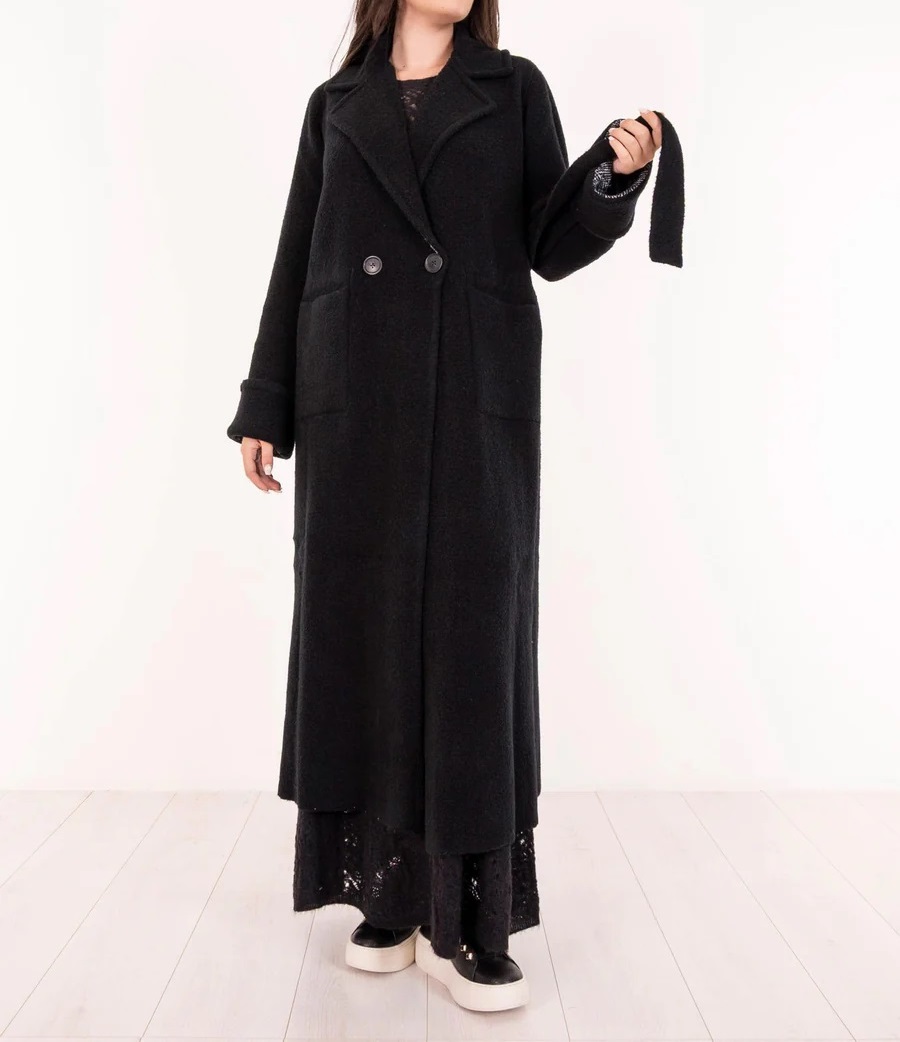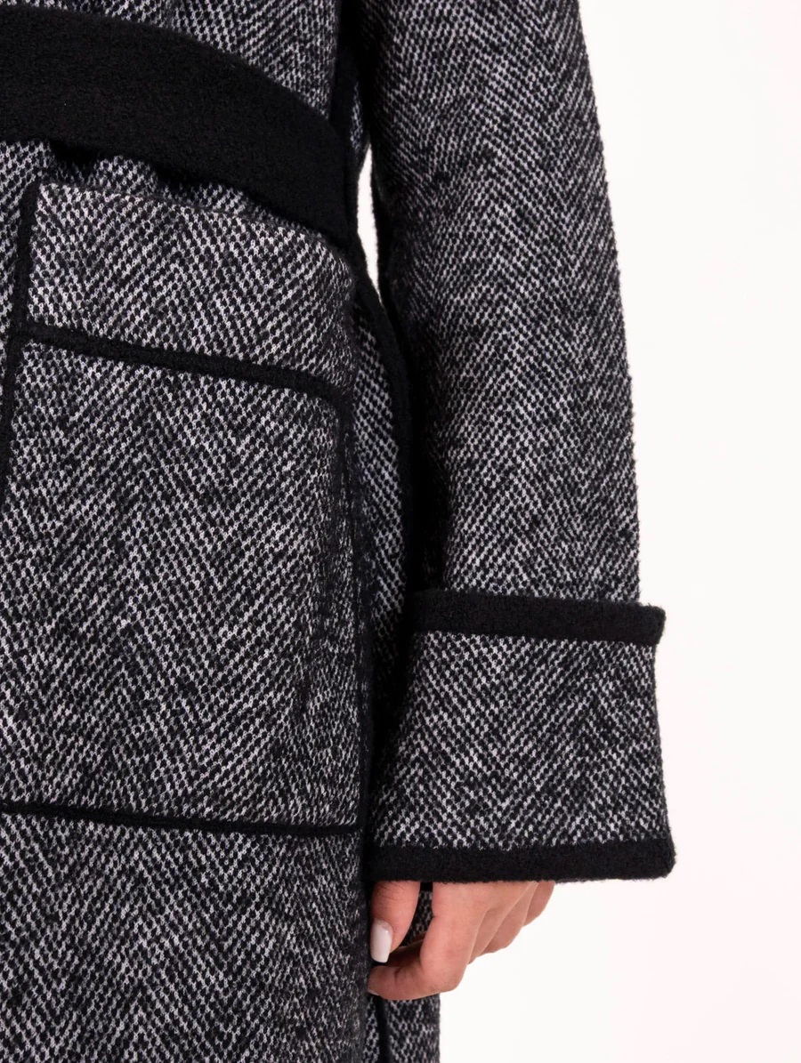 Модель виконана в класичному відтінку з контрастними чорними манжетами та відкладним коміром. Пояс підкреслює талію та додає силуету витонченості. Стильний та універсальний варіант, який ідеально доповнить як діловий, так і повсякденний образ у холодний сезон.
