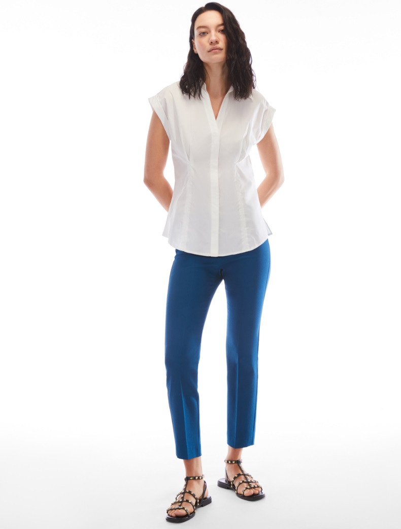Блуза з бавовняного попліну приталеного силуету, з виточками, що переходять у складки спереду. Комір та V-подібний виріз горловини. Потайні гудзики, закруглений поділ та бокові розрізи.