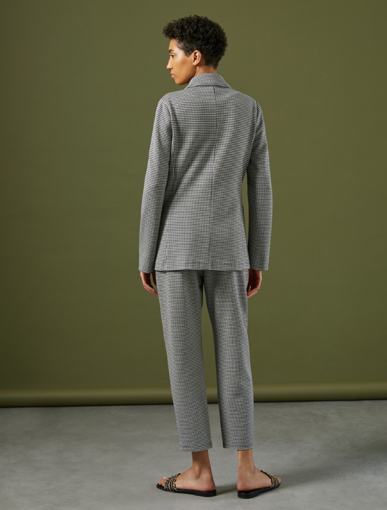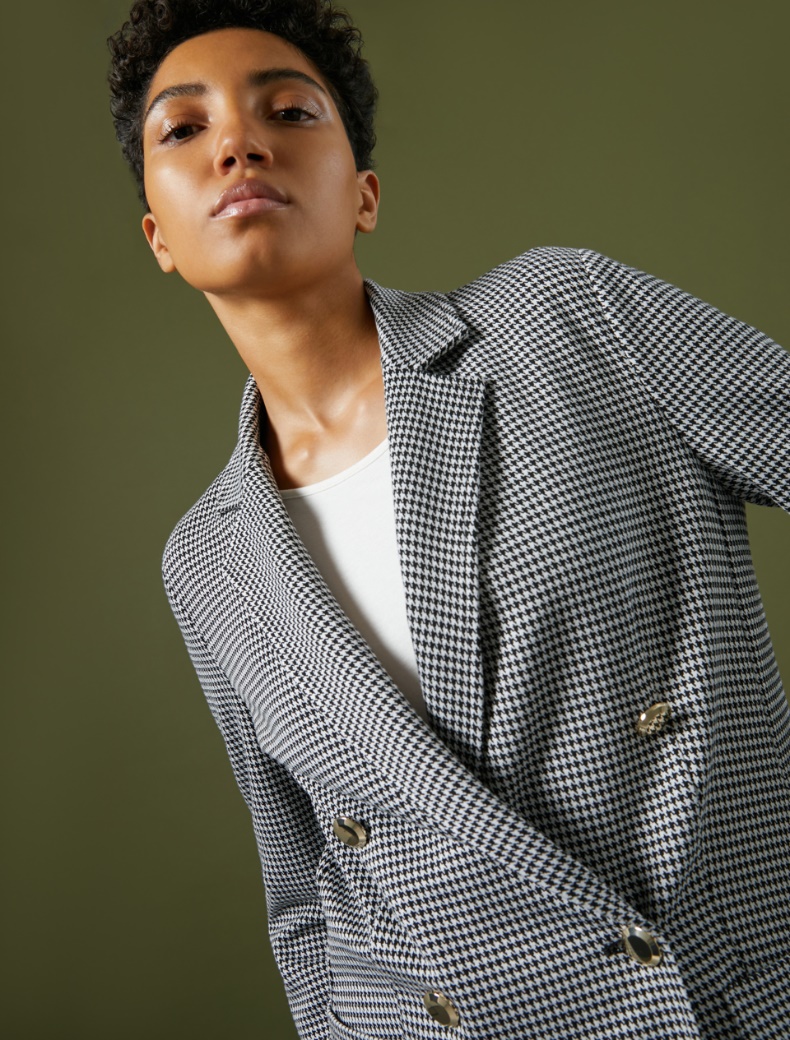 Блейзер із жаккардового джерсі. Орнамент - гусяча лапка. Модель має класичний V-подібний комір, застібається на гудзики.