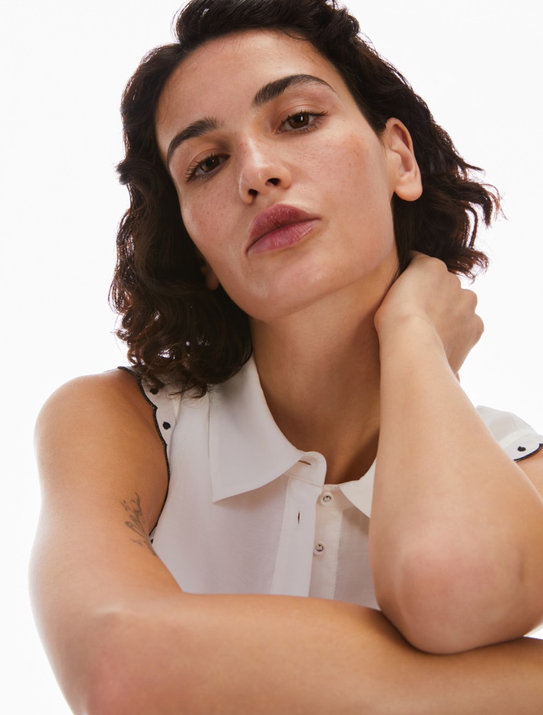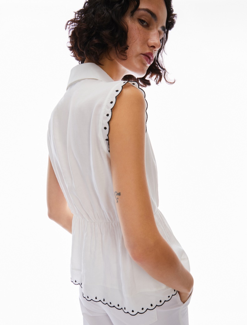 Топ з контрастними рельєфними та вишитими краями. Сорочковий комір на гудзиках підкреслює силует та окреслює талію делікатною збіркою.