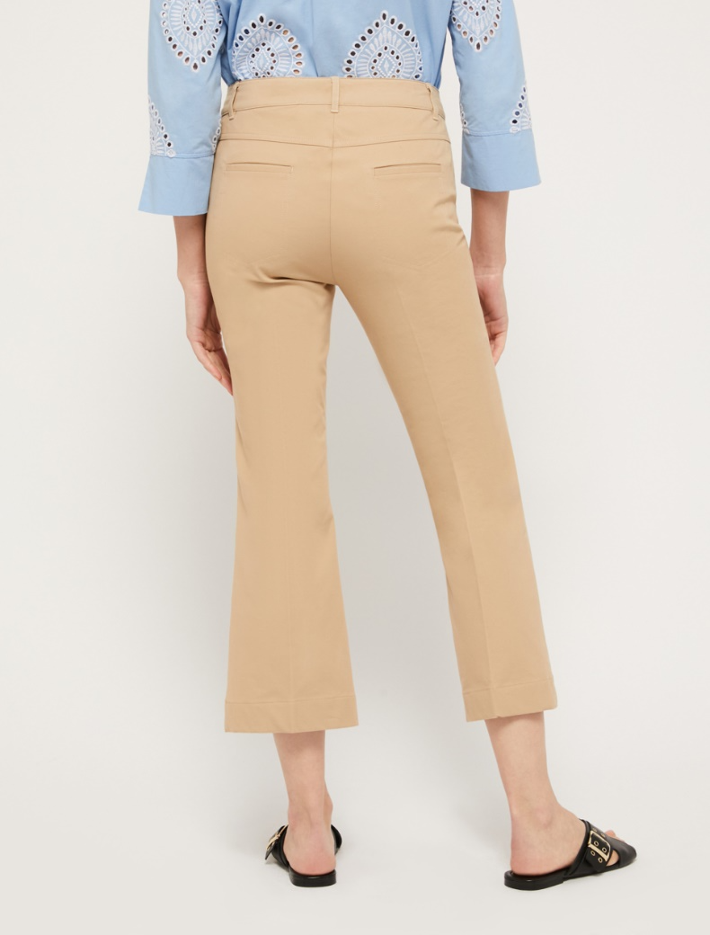 Розкльошені штани з еластичної бавовни. Нормальна посадка, застібається на гудзик та блискавку.
