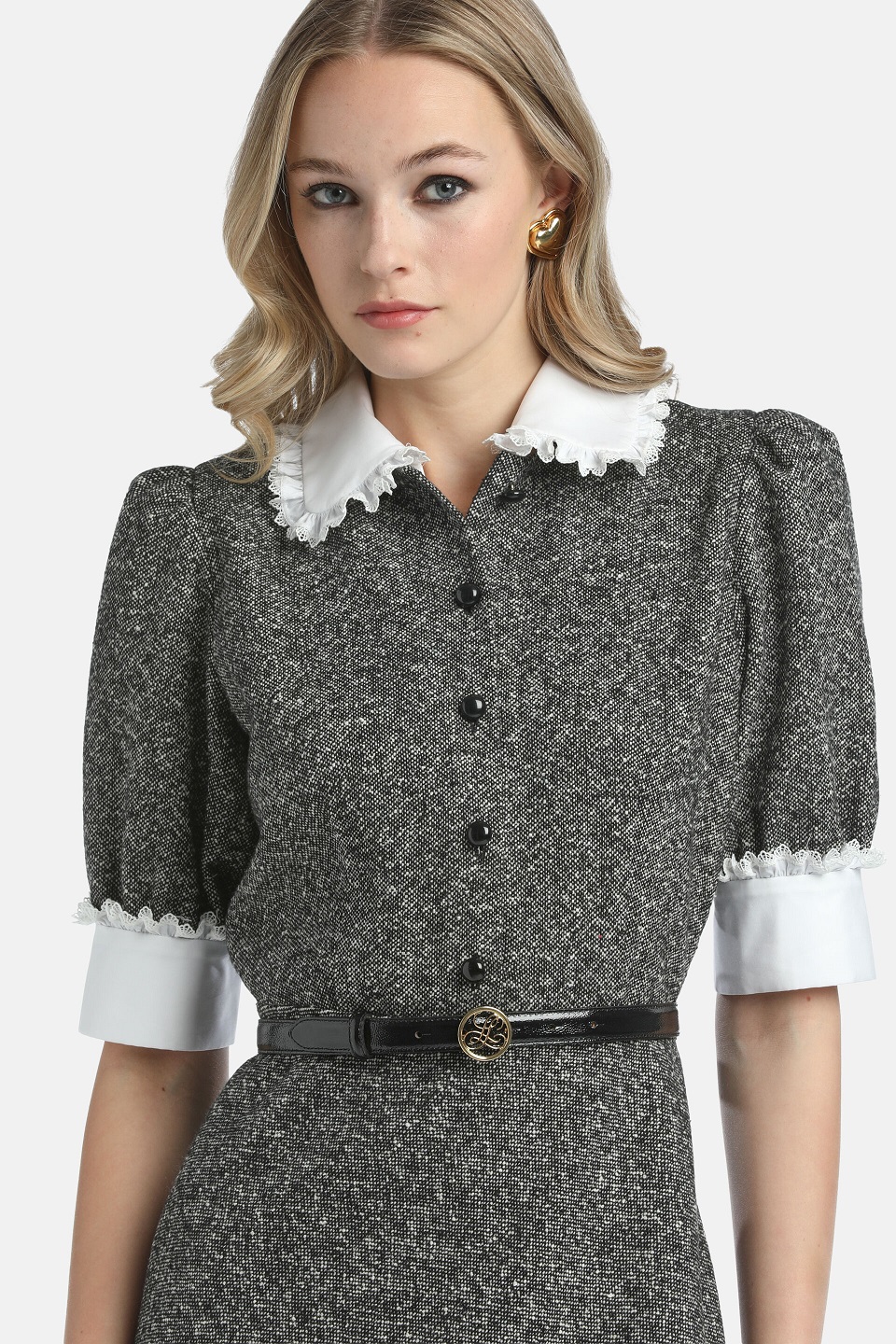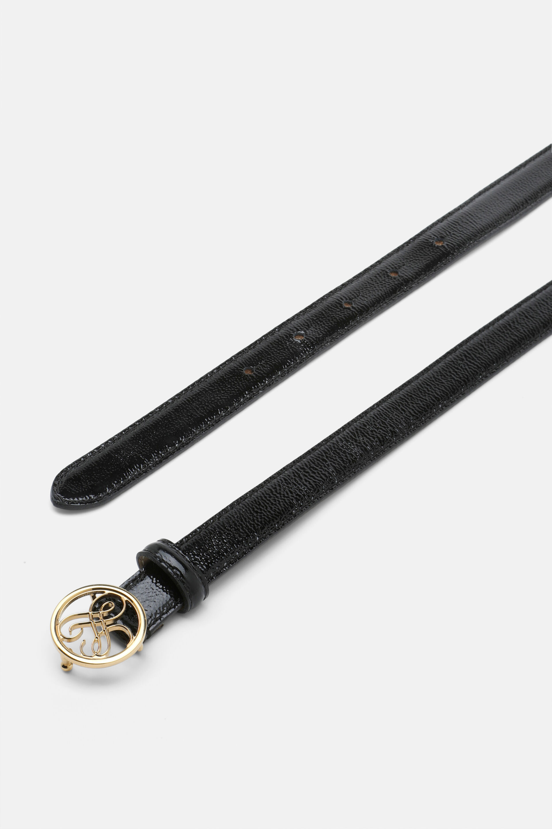 Шкіряний ремінь з тисненням під крокодилячу шкіру, з позолоченою металевою пряжкою та шпилькою. Прикрашений декоративним металевим ланцюжком.