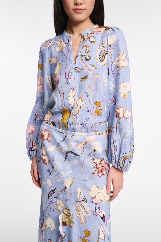 Спідниця максі з принтом з льону має асиметричний косий крій і годе, які створюють декоративні волани.