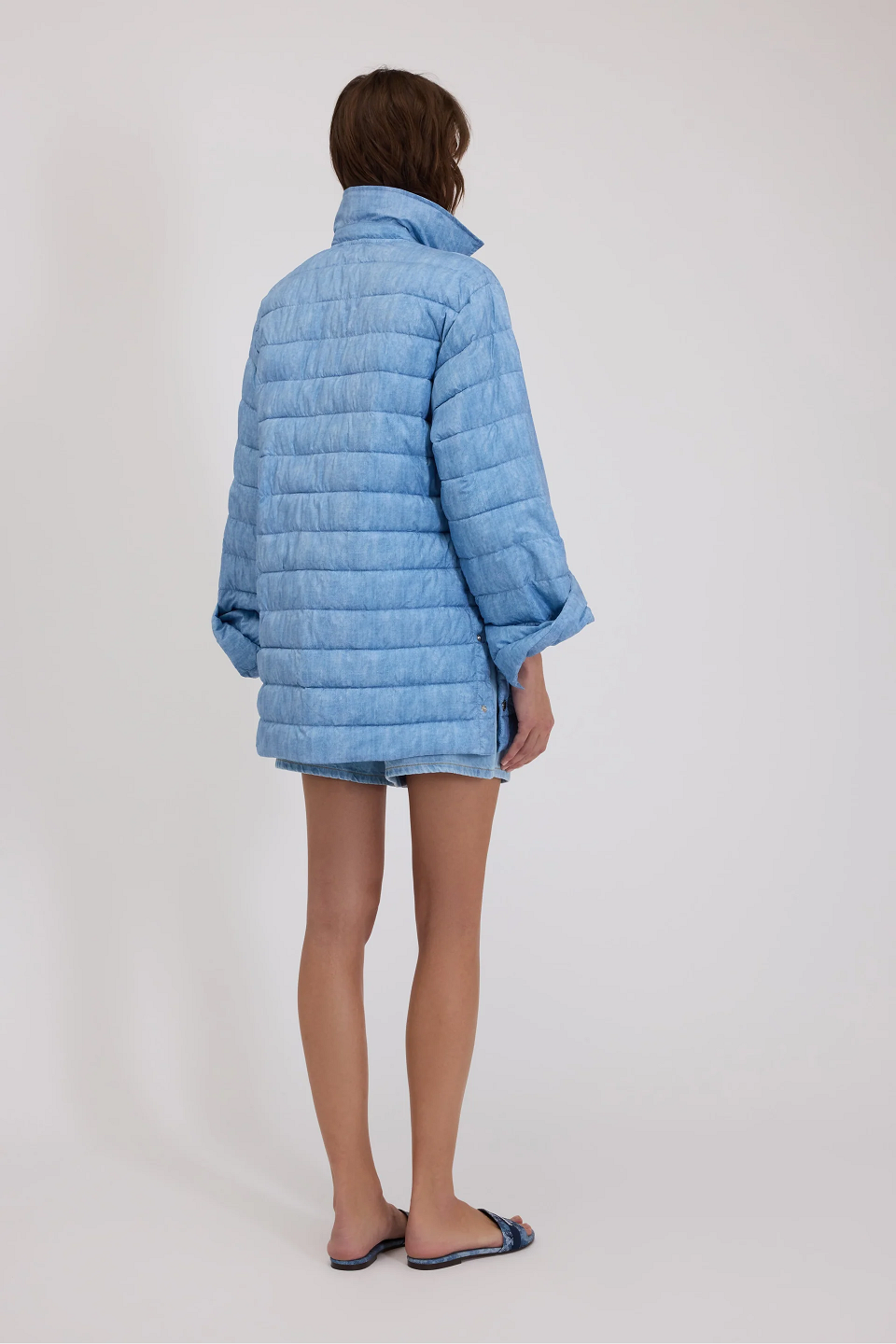 Легка пухова куртка, прикрашена принтом під джинсову тканину та монограмою в тон на рукаві. Застібка спереду на кнопках із логотипом.