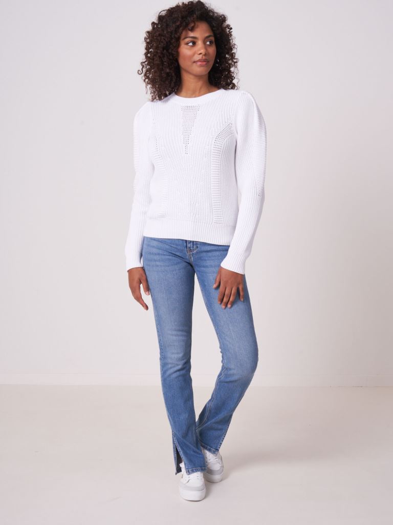 Джемпер із змішаною ребристою в'язкою. Має круглий виріз горловини, довгі рукави-ліхтарики з ребристою структурою, злегка приталений силует.
