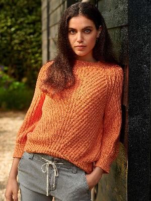 Джемпер діагональної в'язки. Має круглий виріз горловини з ребристим краєм, рукав-реглан.