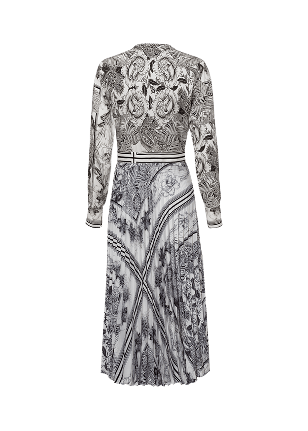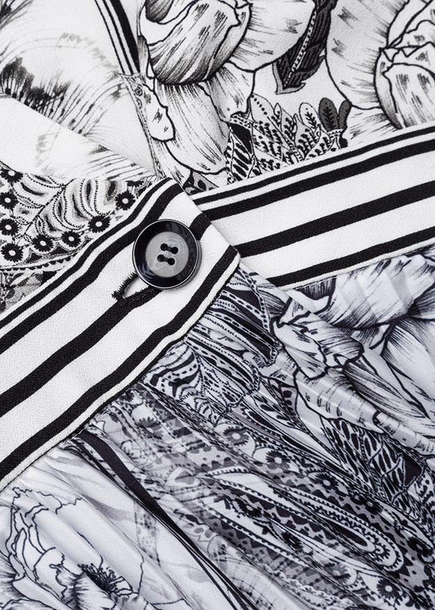 Сукня з віскози із запахом у квітковому принті. Має трохи об'ємні рукави. Спідниця з плісируванням.