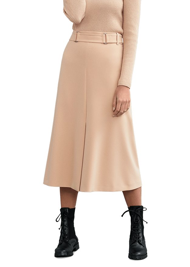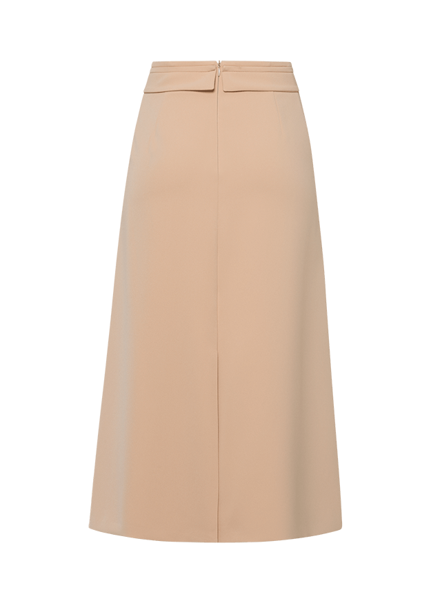 Спідниця має А-силует. Завищена посадка, довжина нижче коліна, пояс в тон.