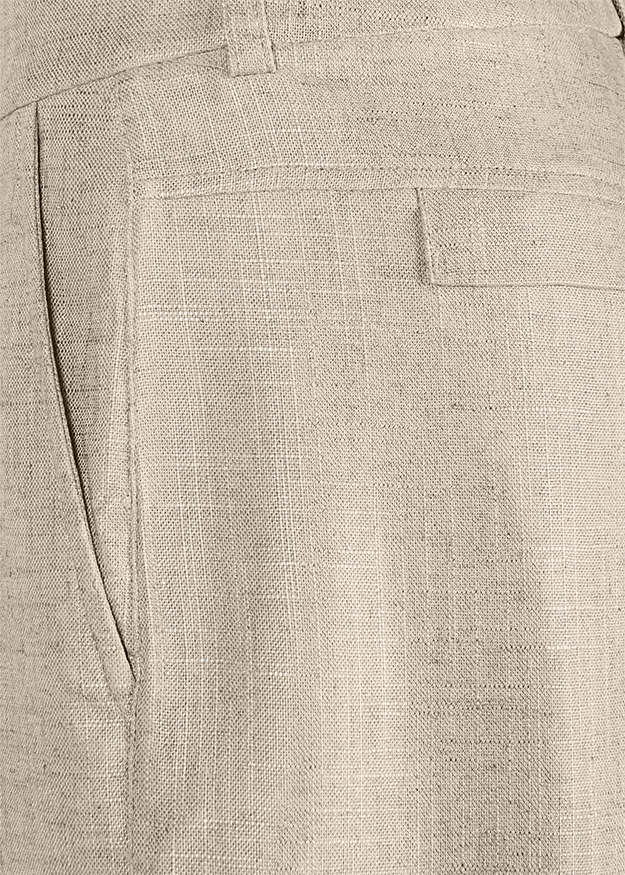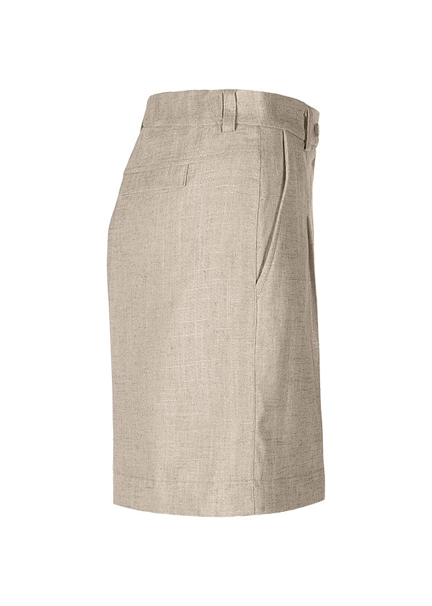 Шорти-бермуди зі злегка мерехтливої суміші льону та віскози натурального кольору. Мають бокові кишені та петлі для ременю.