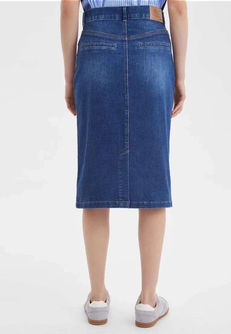 Спідниця з еластичного деніму. Нормальна посадка, довжина нижче колін. Застібається на гудзик та блискавку, має петлі для ременя.