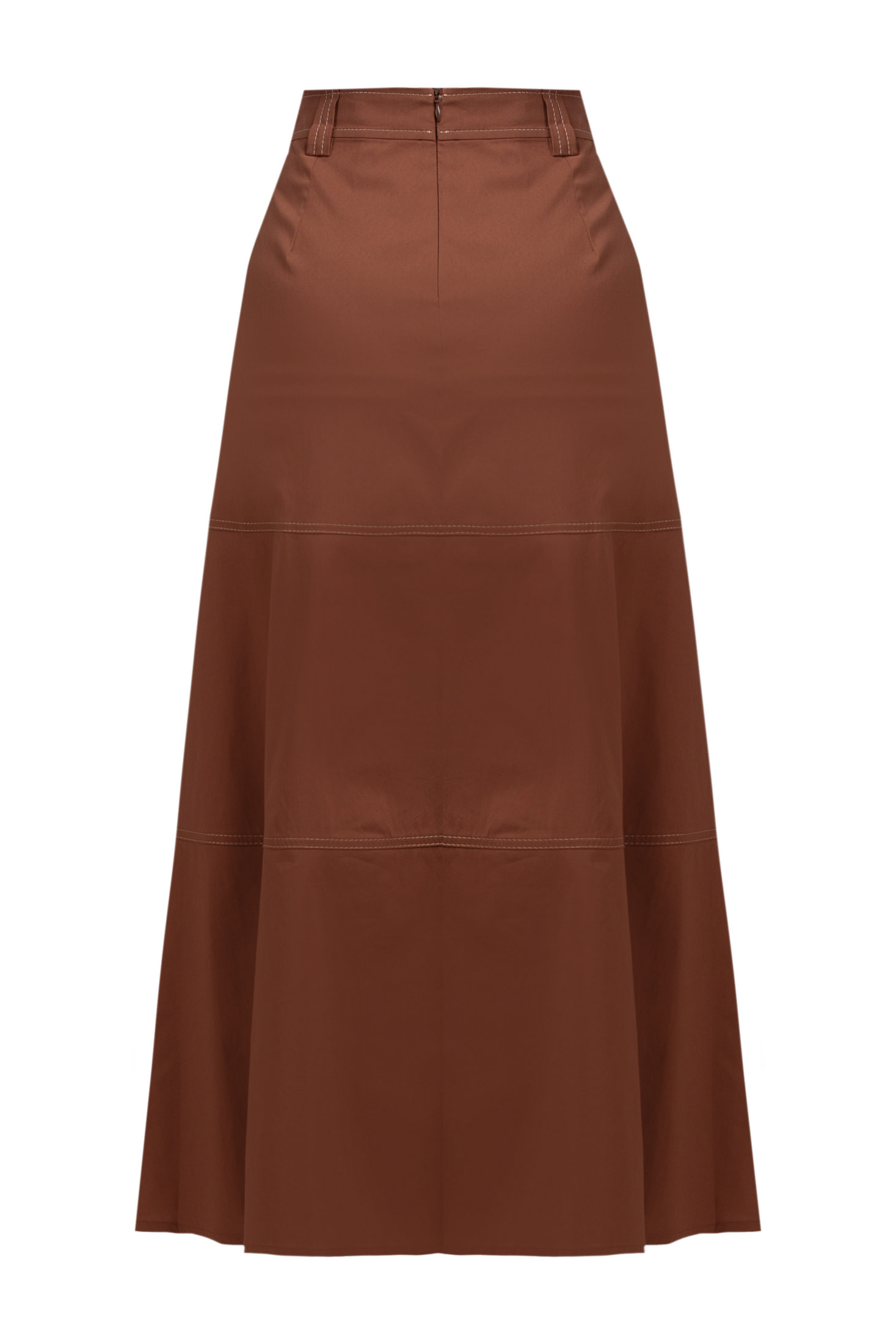 Спідниця має подовжений А-силует, що елегантно підкреслює фігуру. Декоративні шви та витончені деталі на поясі додають виробу характеру. Має шлевки для ременя.
