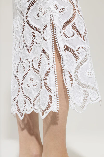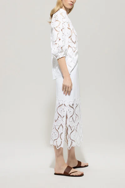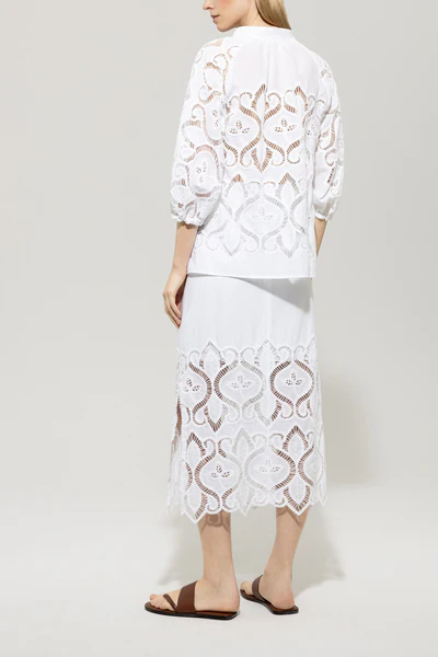 Довга максі-спідниця прямого крою з тонкої бавовняної вуалі зі складною вишивкою на люверсах. Високі бокові розрізи розшиті мереживним подолом в тон.