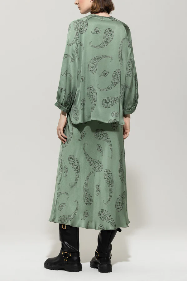 Спідниця з мінімалістичним візерунком «пейслі» на елегантному, блискучому віскозному сатині. Злегка розкльошений крій з зручною еластичною талією.