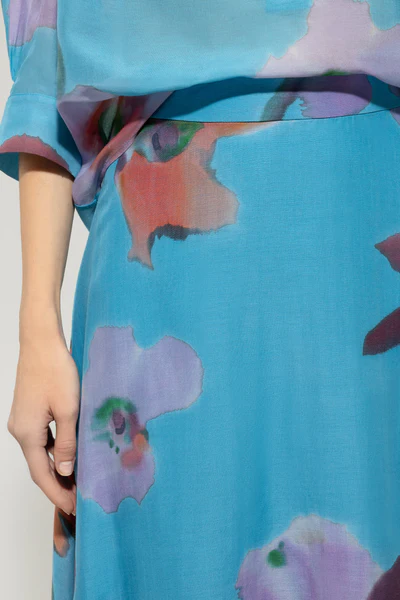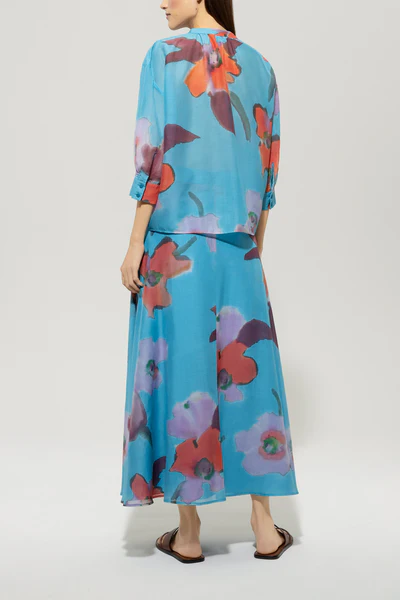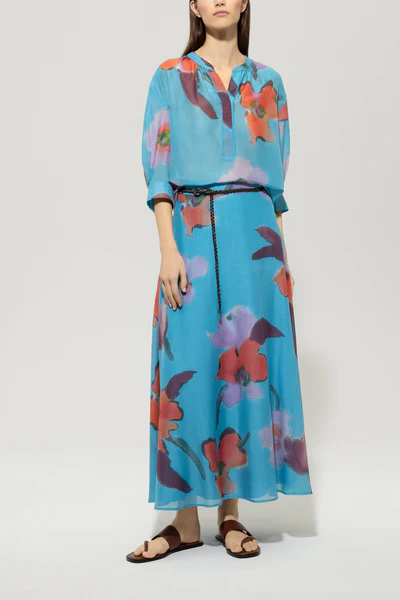 Довга спідниця з абстрактним графічним принтом великих квіток гібіскуса. Літня бавовняно-шовкова вуаль спадає розкльошеною формою з ніжними складками.