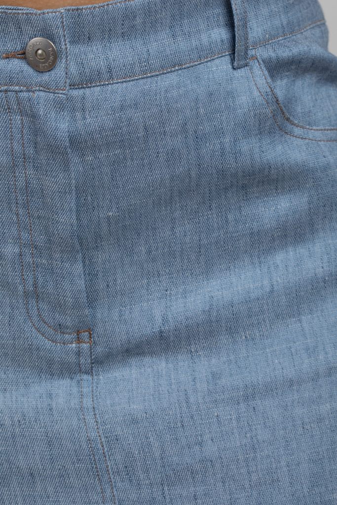 Довга спідниця прямого силуету має високу посадку, пояс із шльовками, застібку на блискавку та гудзик. Лаконічний крій робить цю модель універсальною.
