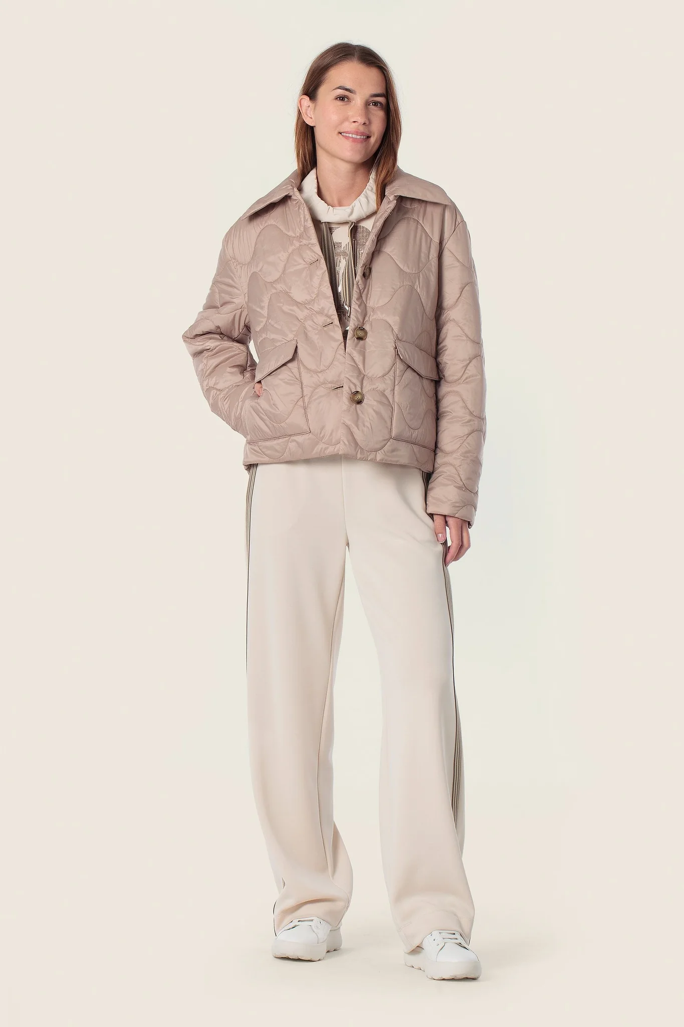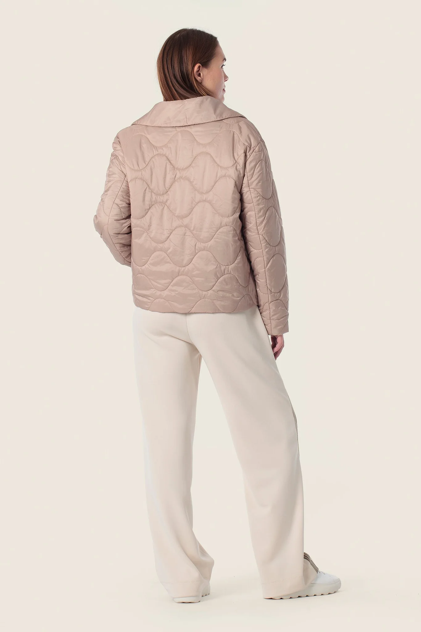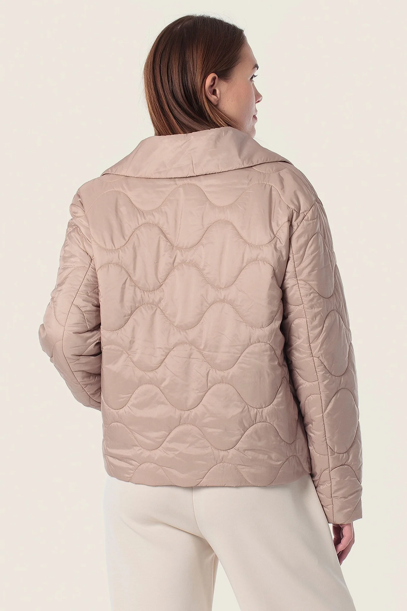 Стильна стьобана куртка з м’якою фактурою, що поєднує комфорт і сучасну елегантність. Модель має прямий крій, відкладний комір та застібку на ґудзики. Декоративна хвиляста прострочка додає образу витонченості, а накладні кишені підкреслюють практичність.