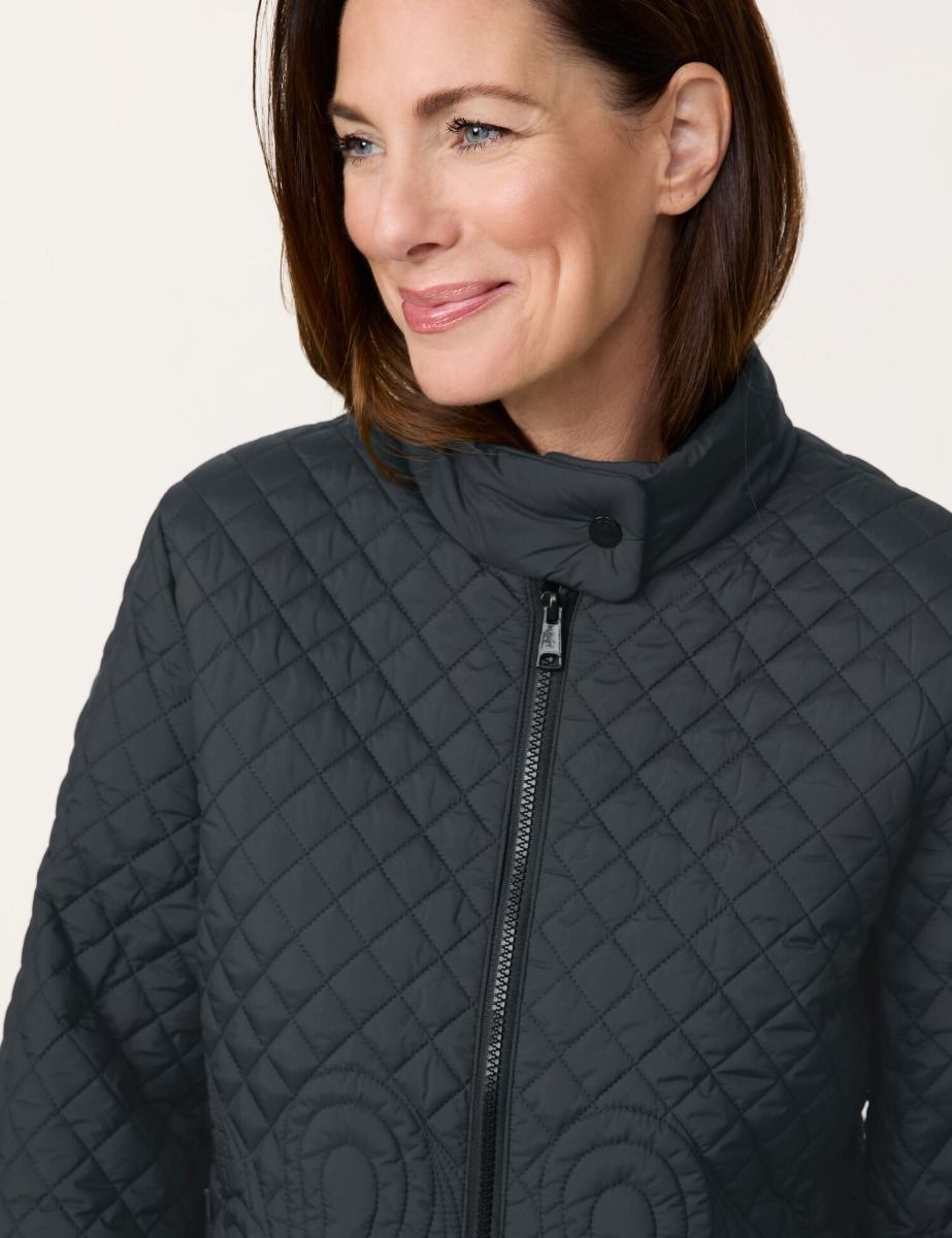 Стильна жіноча куртка з оригінальною стібкою у вигляді геометричного та хвилястого візерунку. Модель має прямий силует, високу стійку-комір для захисту від вітру та застібку на блискавку по центру. Легка, але тепла тканина робить цю куртку ідеальним вибором для осінньо-зимового сезону.