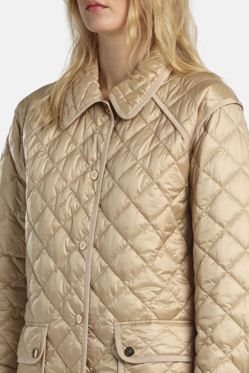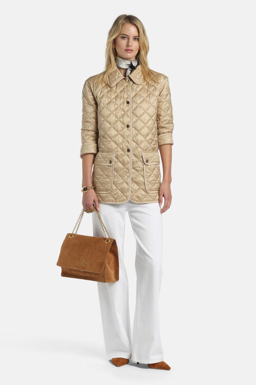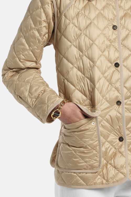 Легка куртка з коміром у стилі сорочки, ромбоподібним стьобанням, кишенями з клапанами на ґудзиках, застібкою на ґудзиках і оздобленням з тонкої стрічки в тон.