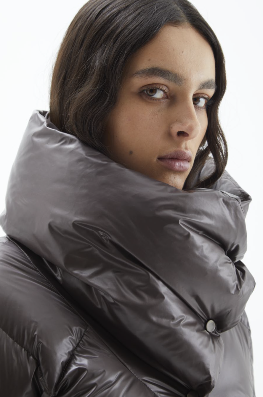 Тепле пальто з об’ємною діагональною стібкою, виконане в сучасному мінімалістичному стилі. Модель має вільний силует, великий утеплений комір та довгі рукави — ідеальне поєднання комфорту й захисту від холоду.