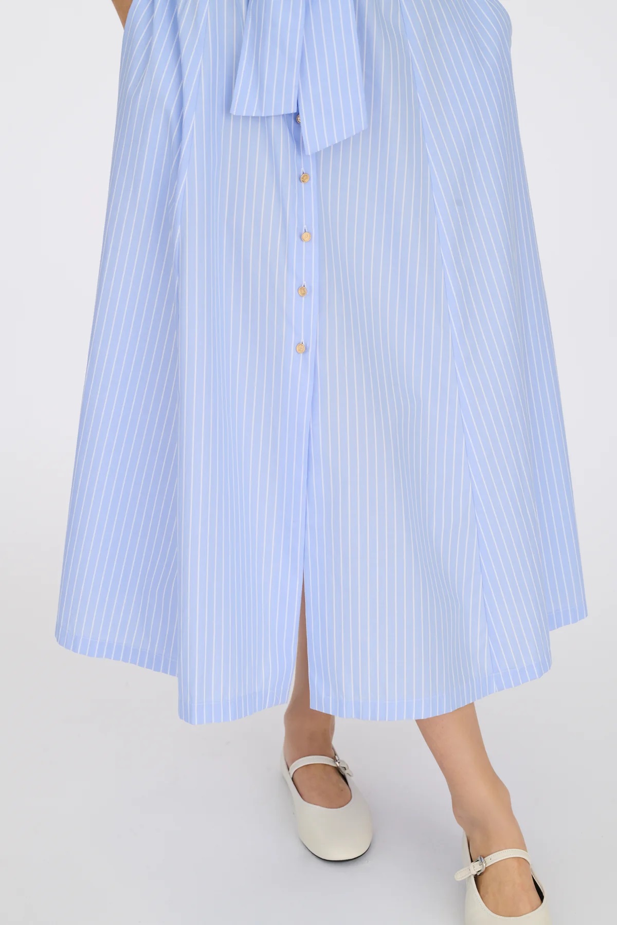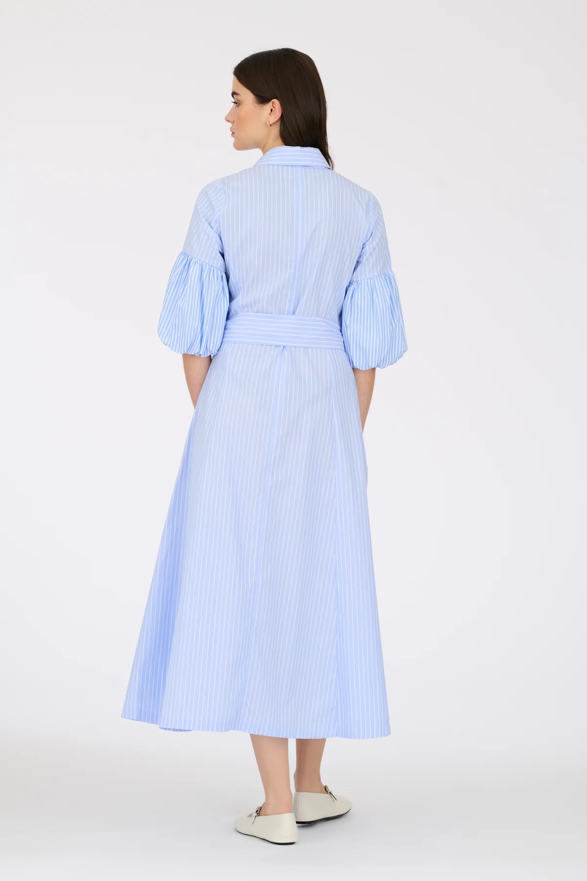 Смугаста довга сукня-сорочка з пишними рукавами. Модель має сорочковий комір, знімний пояс для зав'язування на талії, застібку на ґудзики та дві бокові кишені.