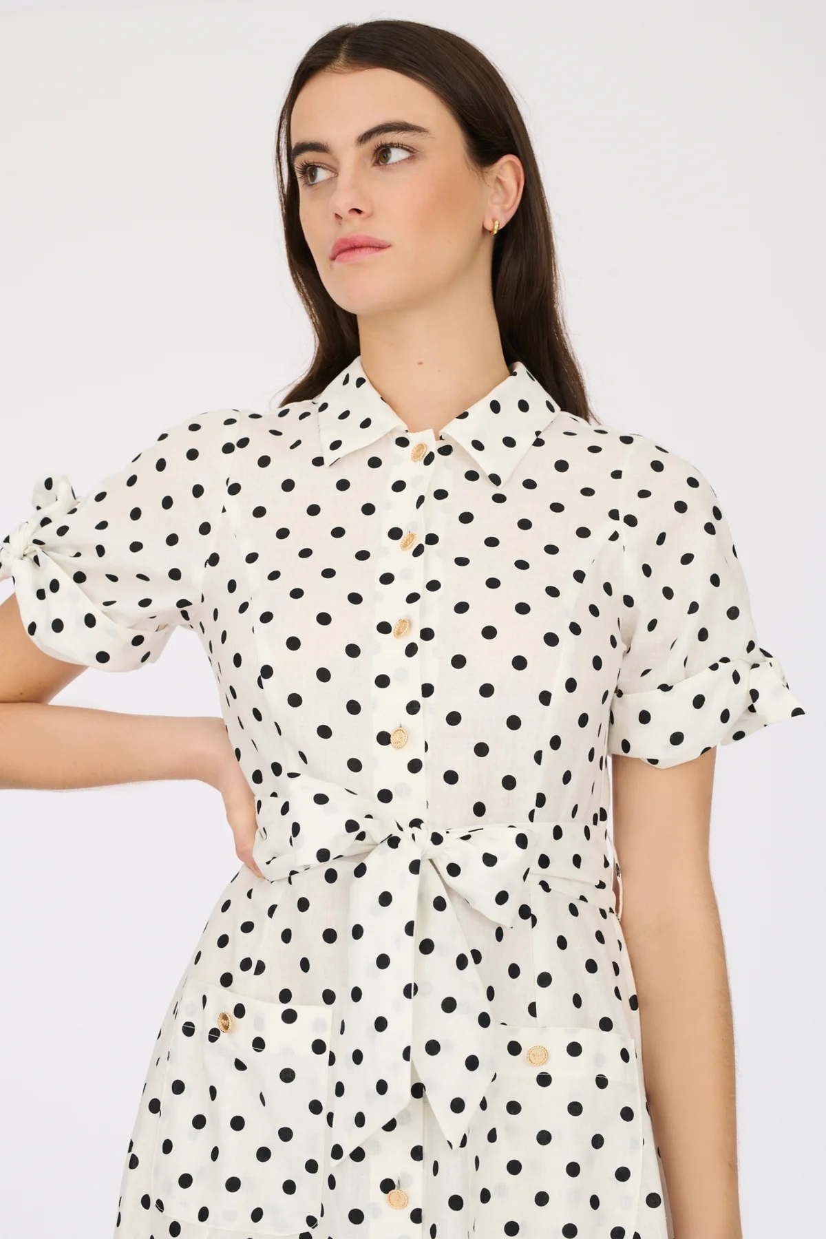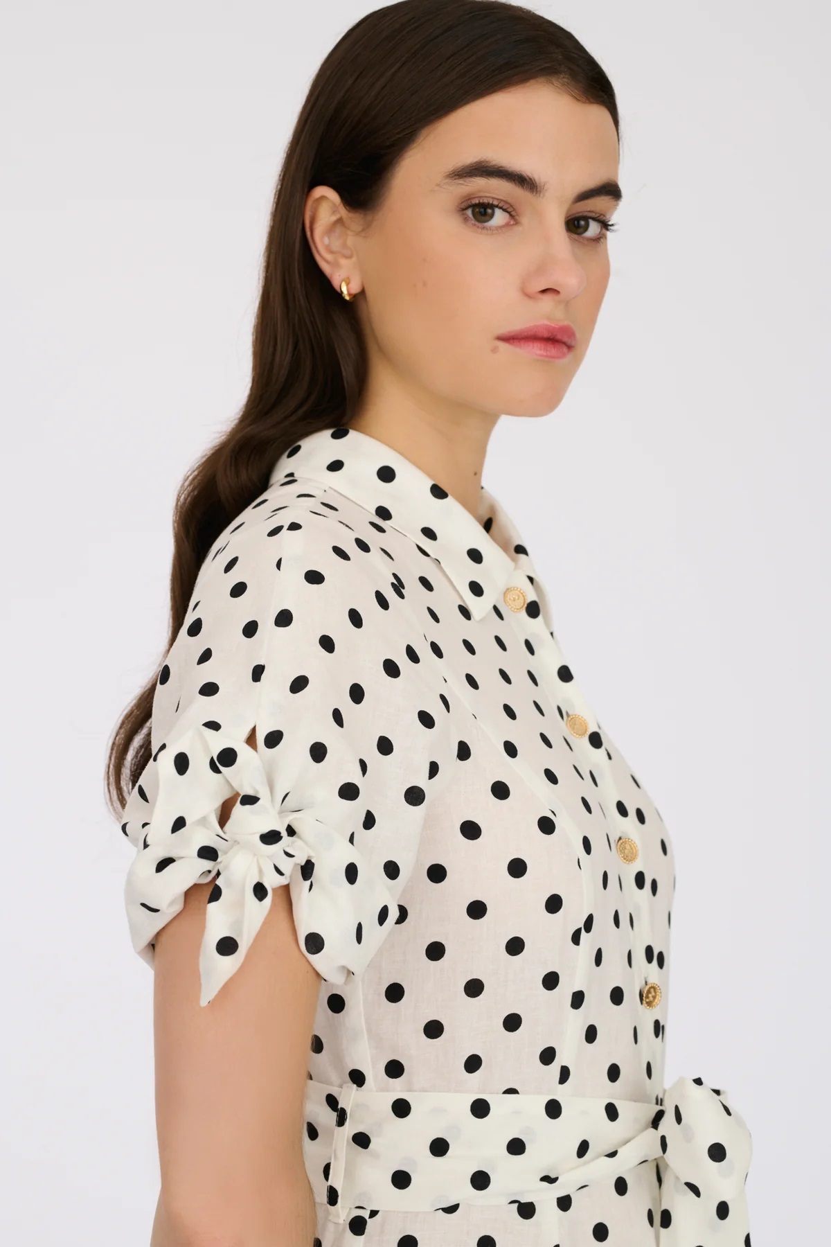 Сукня-сорочка в горошок з поясом-краваткою для шикарного ефекту. Модель має сорочковий комір, рукава на манжетах з краваткою-метеликом, застібку спереду на індивідуальні золоті ґудзики Weill.